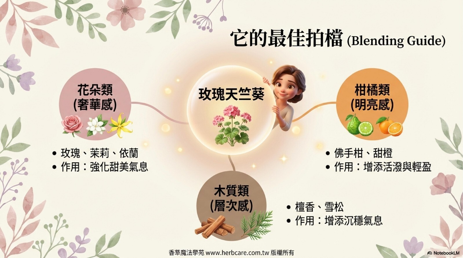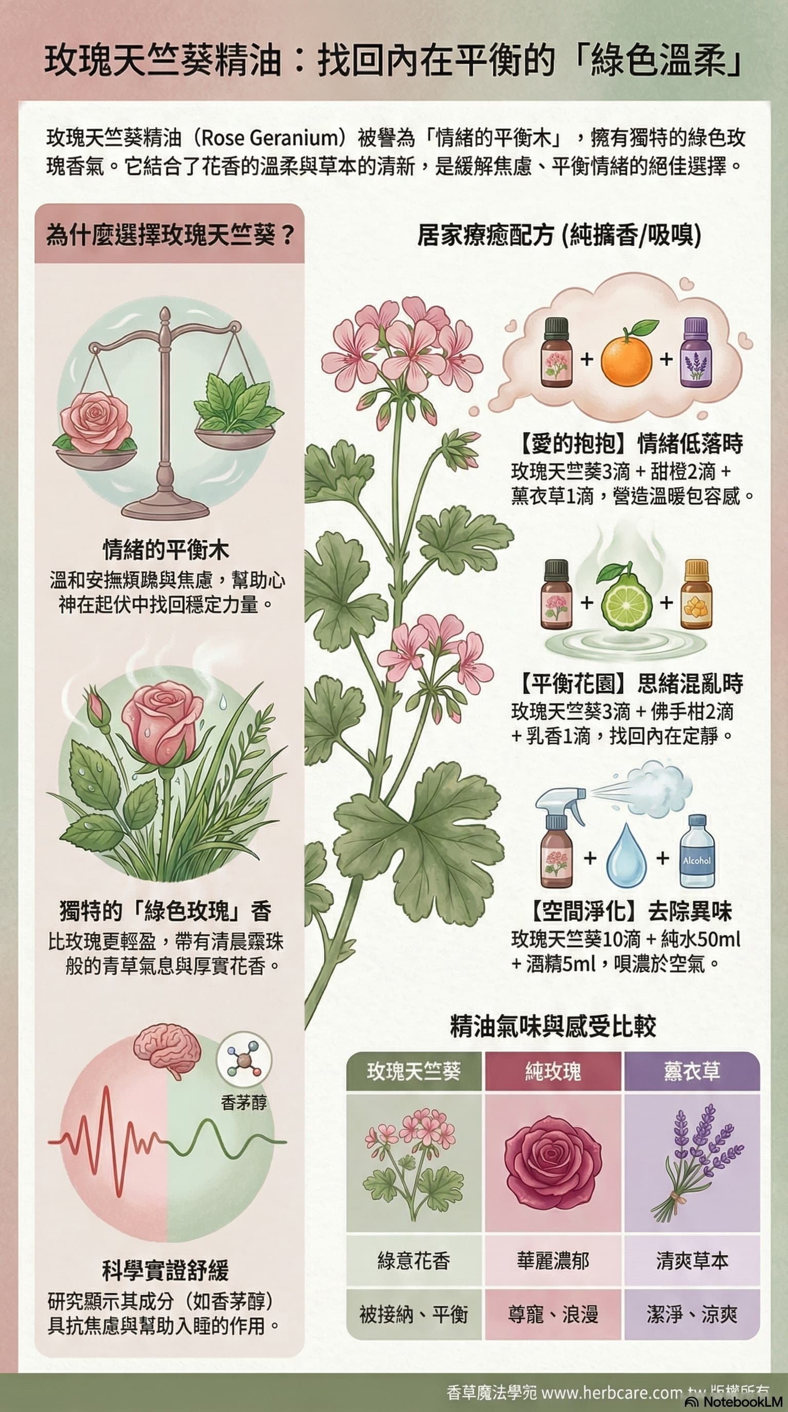 玫瑰天竺葵的溫柔香氣,可以與多種精油創造出不同的應用效果。