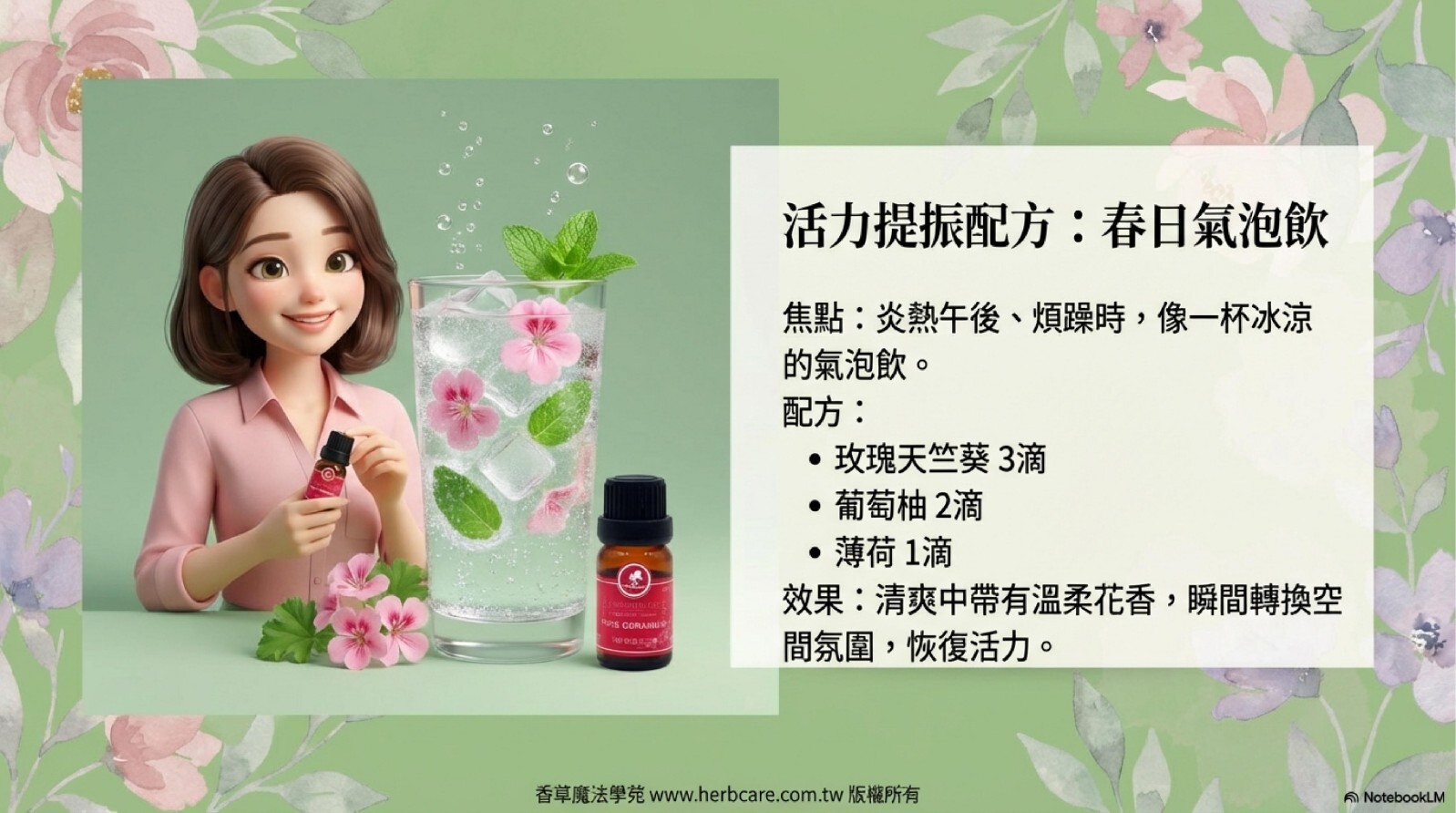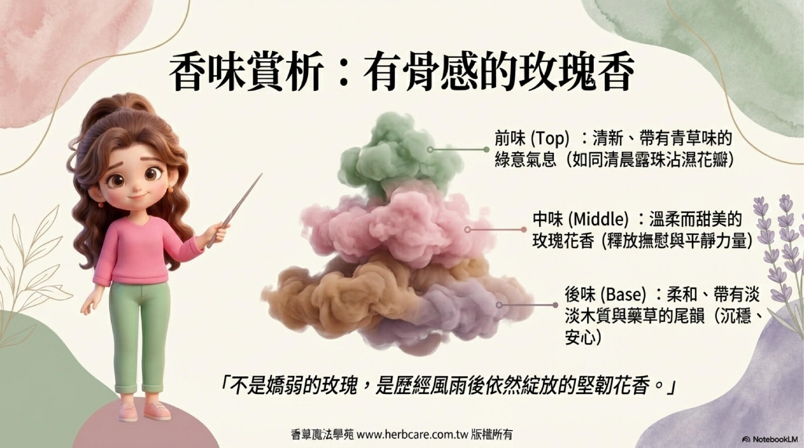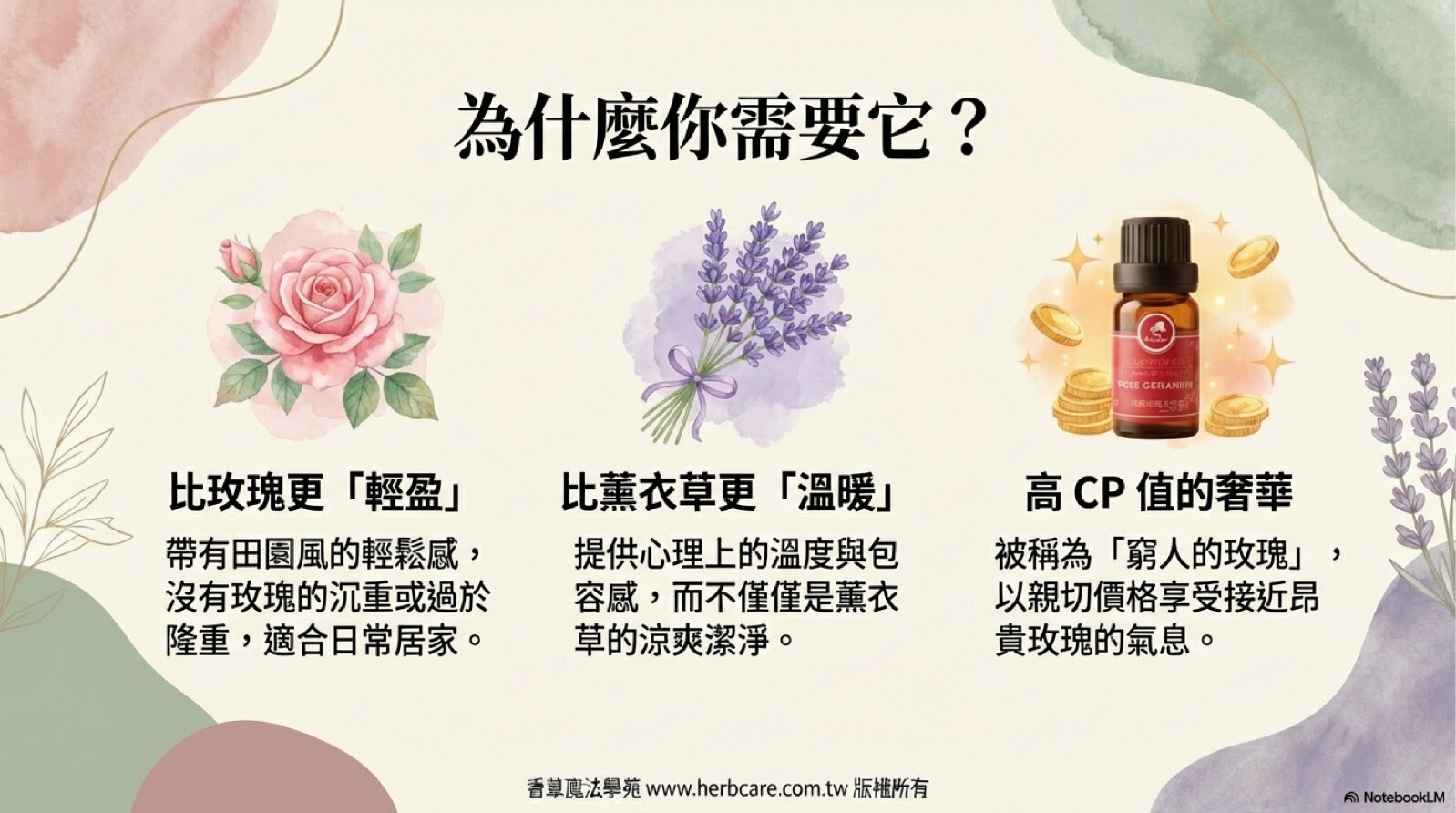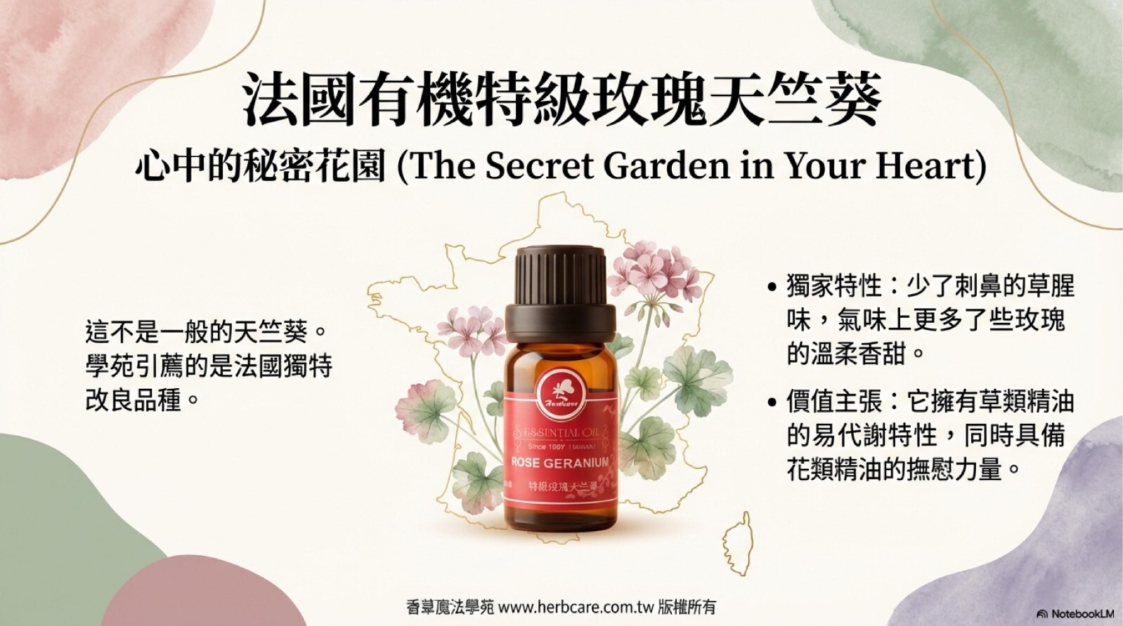 玫瑰天竺葵的香氣層次豐富,充滿了溫柔而甜美的花草氣息。
