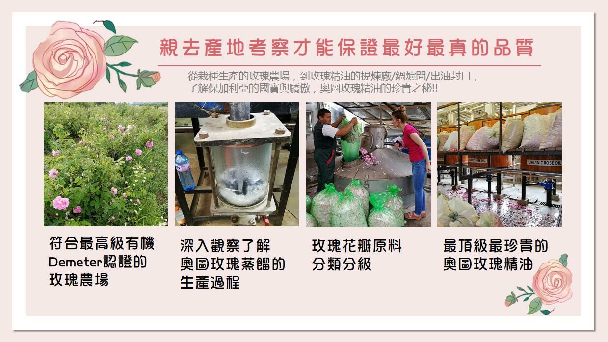 保加利亞因為是玫瑰的主產地,所以比較能提供一致的標準,例如奧圖玫瑰可以說是市面上最貴的玫瑰精油,它的顏色、香味、成分都有嚴謹的規範標準,只能跟正式、有信譽的管道購買。玫瑰原精雖然價格比較便宜,但是萃取的方式能保留更多的香氣,所以性價比更好。