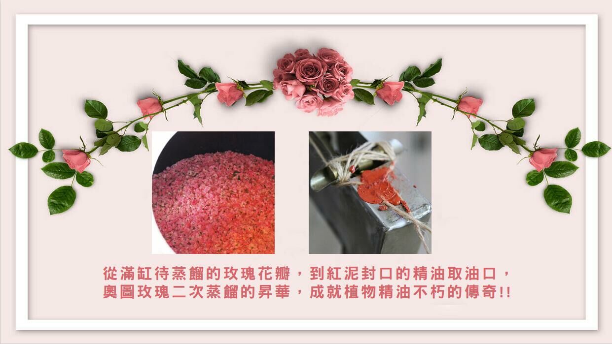 奧圖玫瑰(蒸餾法)有極強大的純化與磁場能量,適合與其他同等級的珍貴精油,如檀香、茉莉、桂花……調配頂級能量香水,共同展現人間最極致高貴的香氣享受。