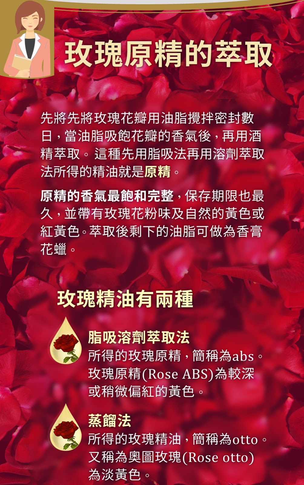 玫瑰是精油萃取中價格最高、品質最難掌握的,主要的萃取方式為蒸餾法與脂吸法。用蒸餾法取得的玫瑰精油稱之為「OTTO」,也有人稱之為「奧圖玫瑰」,其實奧圖不是品種而是專指蒸餾取油的方法,而脂吸法取油則稱為「ABS」,也稱玫瑰原精。
