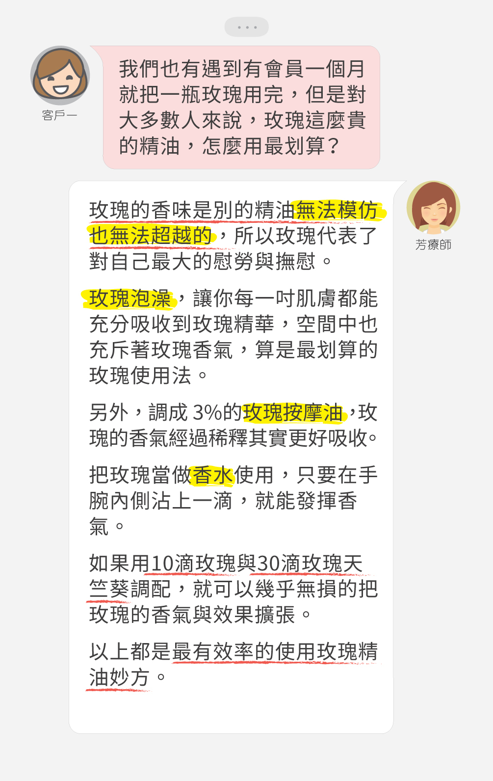 其他的玫瑰精油都有其獨特的香氣特徵,也都能表達出不同的頂級精油給人的心靈感受,都是很好的體驗。