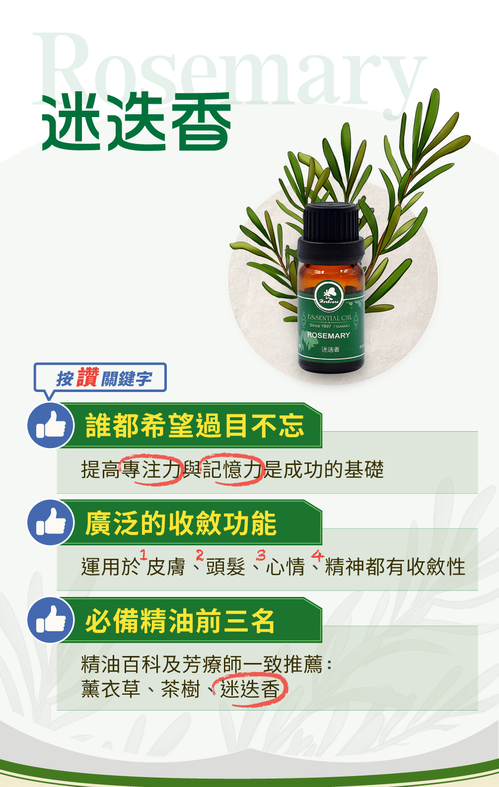 學苑嚴選迷迭香精油中最實用的CT2桉油醇迷迭香,滿滿1,8-桉油醇,讀書、工作、開車醒腦用途最廣,香氣更具清新、穿透力新鮮草本香。迷迭香精油助於集中注意力,啟發靈感,大文豪莎士比亞還給了迷迭香「記憶之草」的稱呼,芳療上尤其推薦銀髮族、考生族使用,亦適合加入洗髮精,並且能與多種精油發揮綜效,是精油玩家必備的超實用精油!