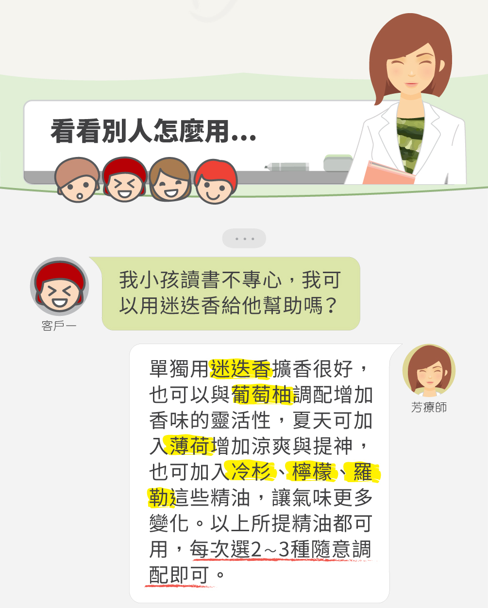 | A4: 迷迭香精油的香氣具有提神醒腦作用,因此不建議睡前使用,以免影響入睡。 |