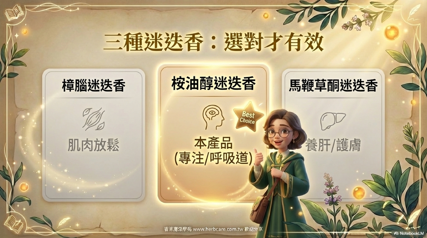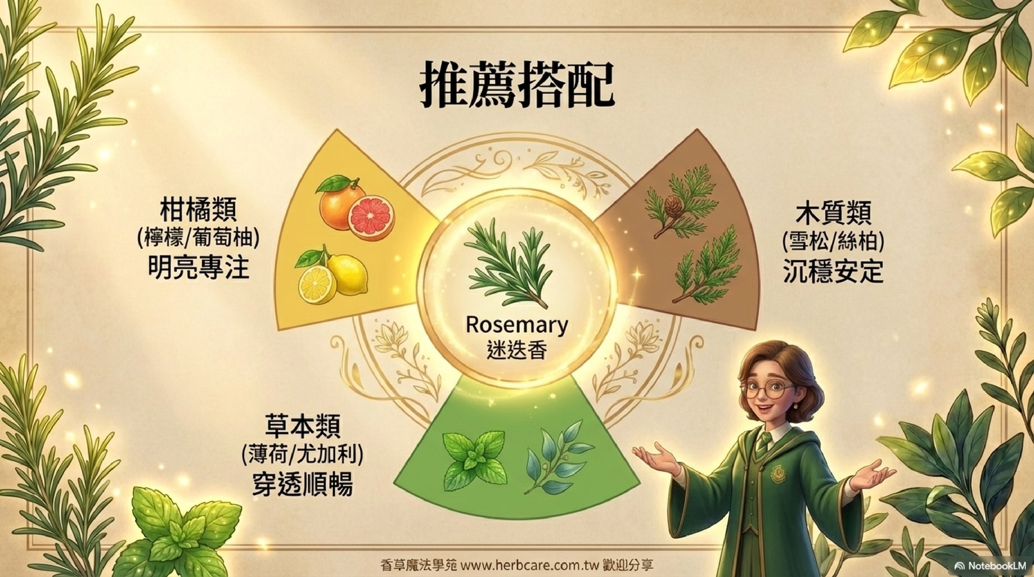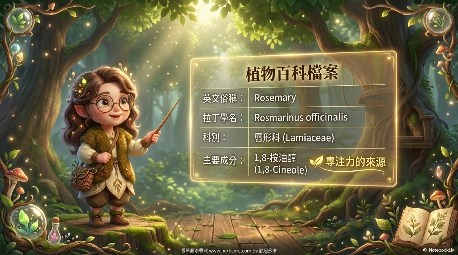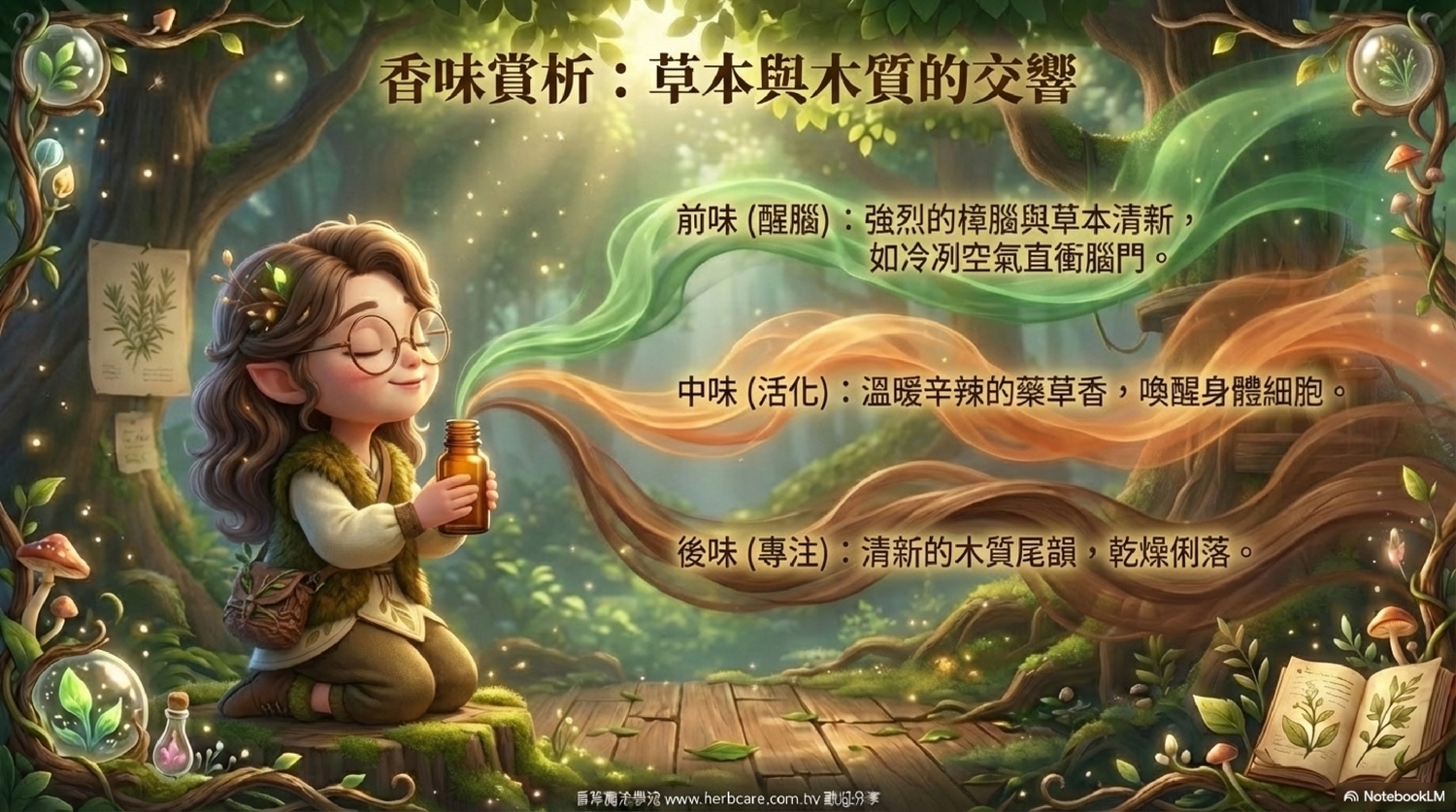 | A1: 迷迭香精油因其主要成分之一為1,8-桉油醇,這種成分帶有類似樟腦的穿透性氣味,是其特有的香氣特徵。 |