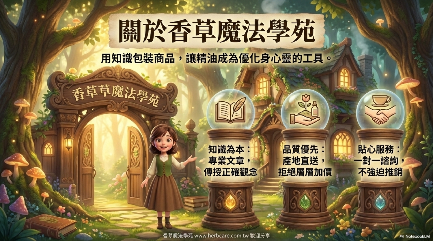 創立於20多年前,香草魔法學苑不只是個精油網站,更是由一群熱愛精油的同好共同打造的學習社群。我們相信,精油不只是商品,而是能優化身心靈的美好工具。因此,我們致力於「用知識包裝商品」,讓你先了解精油,再找到最適合你的選擇。