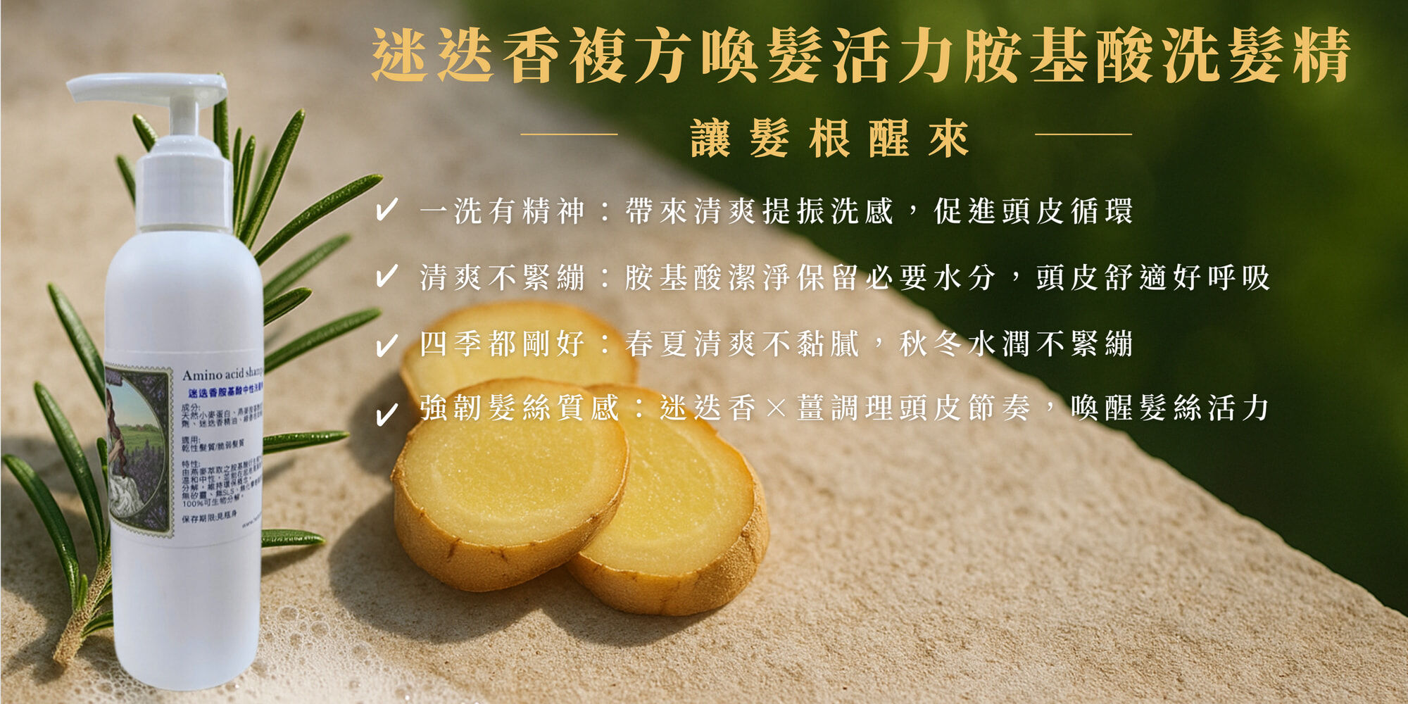 當壓力、油脂與疲憊堆積在頭皮上,不只頭髮易斷,連思緒都會變得沉重。迷迭香複方喚髮活力胺基酸洗髮精,以清新草本能量,喚醒沉睡的髮根與頭皮活力。天然胺基酸泡沫細緻綿密,溫和帶走多餘油脂與老廢角質;結合迷迭香精油、薑精油、香根草精油等複方草本,為頭皮注入一股清爽的「綠色能量」。水解小麥蛋白深入滋養髮絲結構,讓髮根更強韌、髮絲更輕盈有彈性,每一次洗髮,都是一次頭皮的呼吸練習!