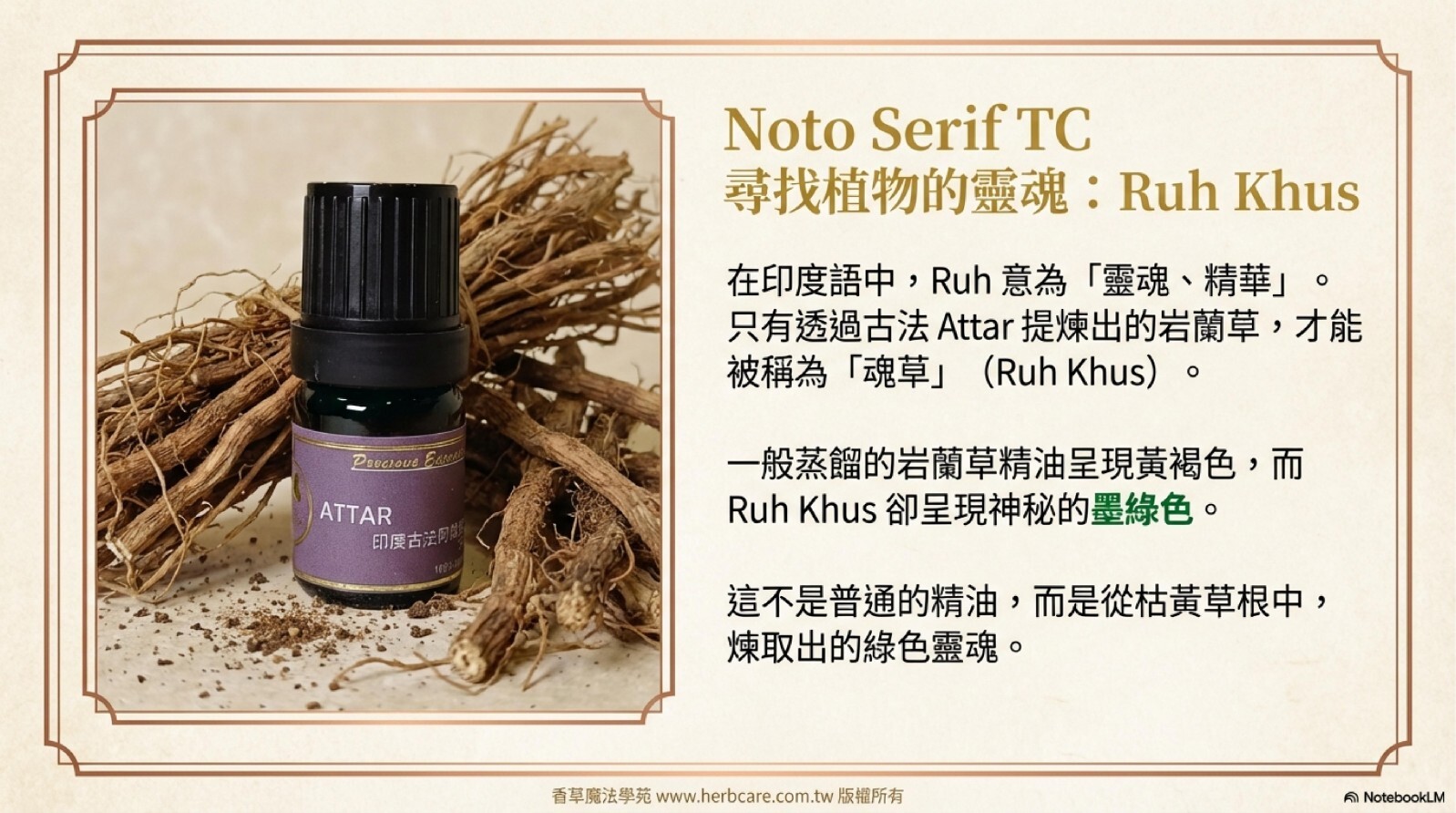 魂草、綠岩蘭草、Ruh Khus,都是描述同一個對象,也就是用Attar提煉出來的綠色的岩蘭草精油。