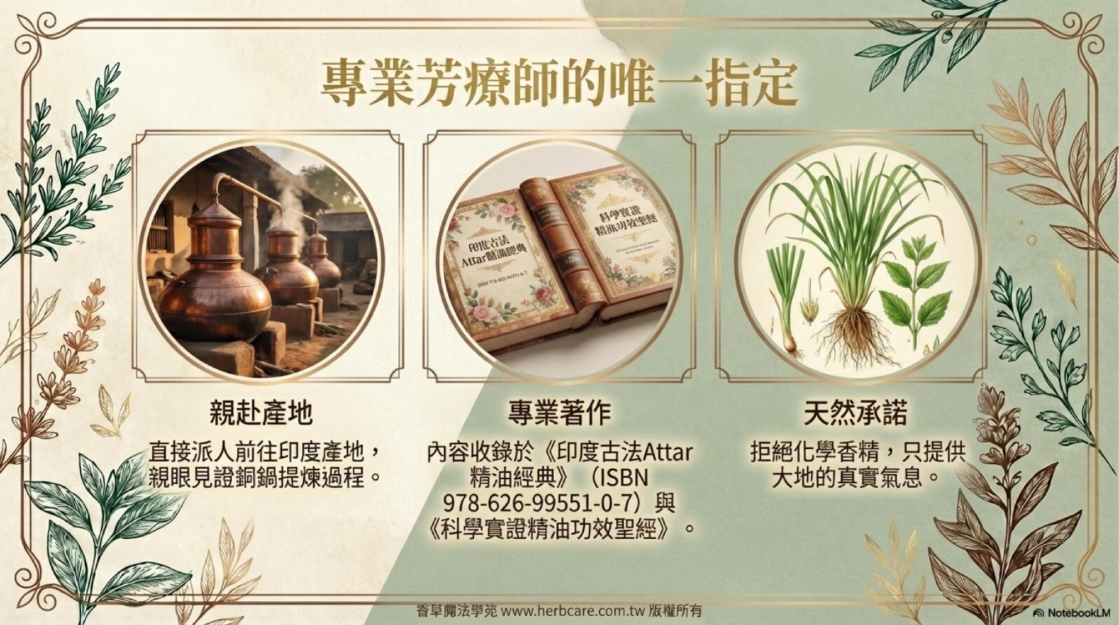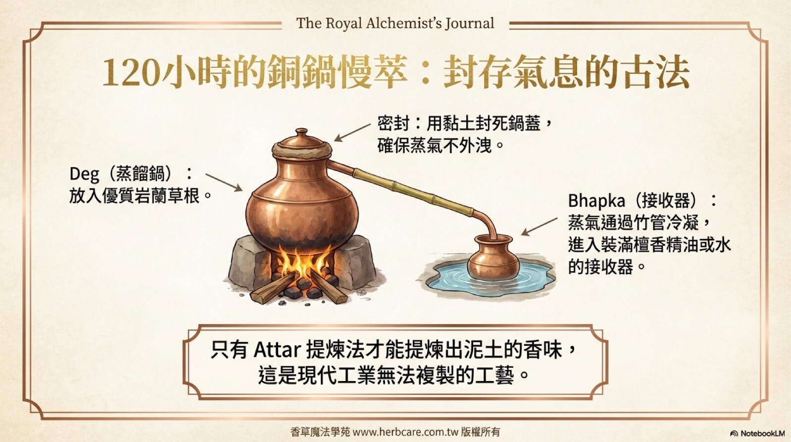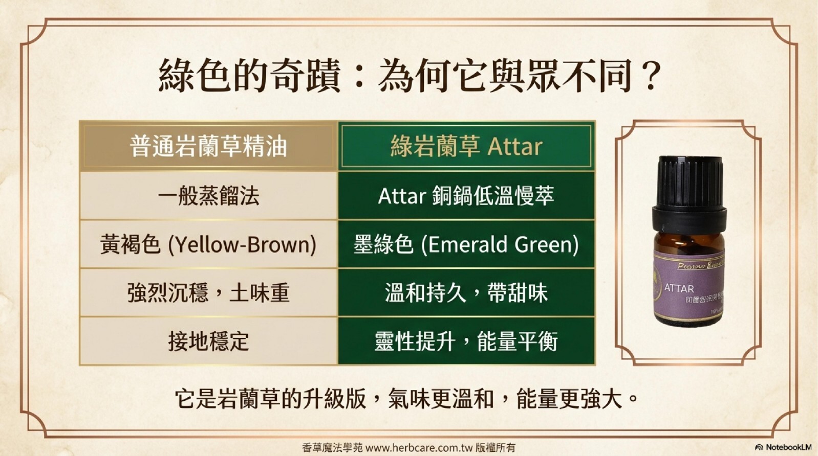 明明可以用正常的精油蒸餾法可得,為何要費勁用Attar法練出岩蘭草的綠色靈魂?