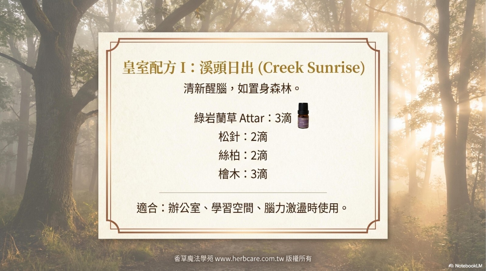 調配目的: 模仿森林的清新空氣和寧靜氛圍。