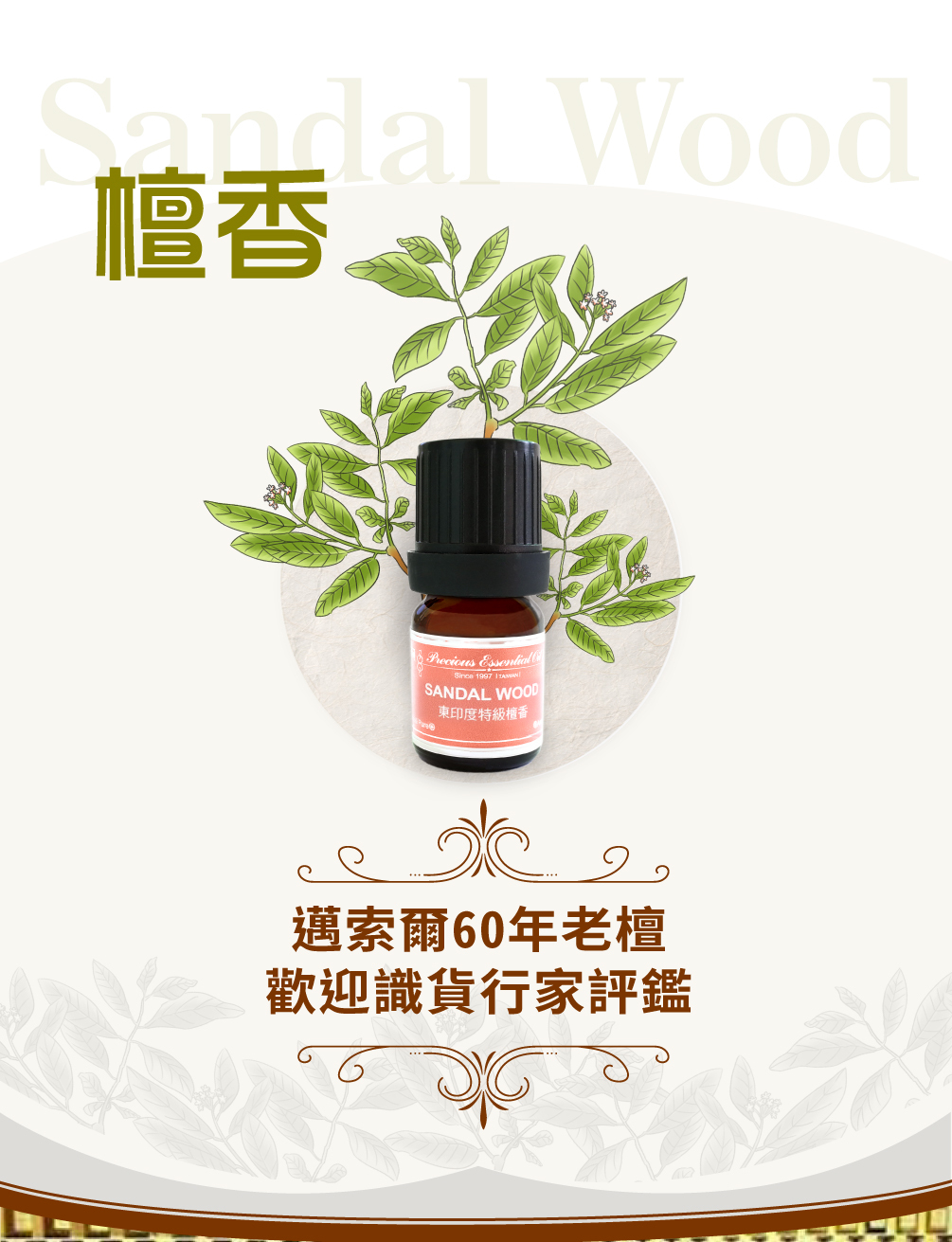 印度特級檀香精油,蒸餾自檀香木的木心,學苑精選正宗來自東印度邁索爾的檀香精油,且是六十年的老檀木,其木質香甜陳郁市上少見,檀香精油之所以珍貴在於他的稀有,在於他必須是野生,且前三十年寄生在其他樹根而生,故植林不易,一直帶有東方神祕色彩的檀香,是很適合冥想、靜坐時使用。學苑庫存的60年特級檀香,只有識貨的行家才知道它的珍貴,希望您能好好珍惜使用印度特級檀香精油!