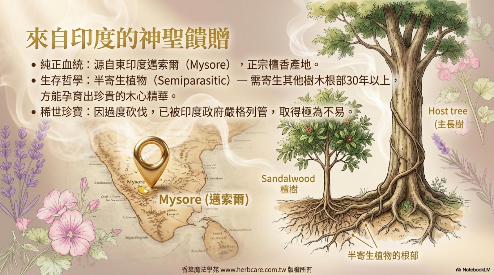 檀香木是一種半寄生木,樹齡要達三十歲以上才能煉出好的精油,因為香味獨特,在印度被視為經濟價值極高的樹木,目前在印度的每顆檀香木都有編碼,被當地政府列管。近年來由於大量的砍伐使得檀香木數量銳減,所以印度官方也採取限制出口的措施。