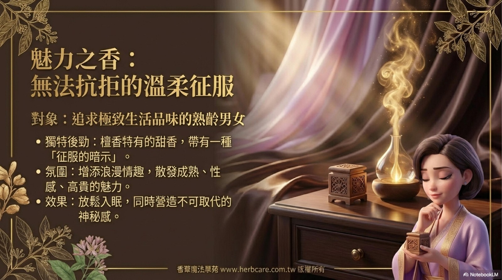 檀香的後勁帶著特有的甜香味,有一種征服的暗示,所以也可以用在臥房增加情趣,因為征服感帶來的性感,狂野無上限!!