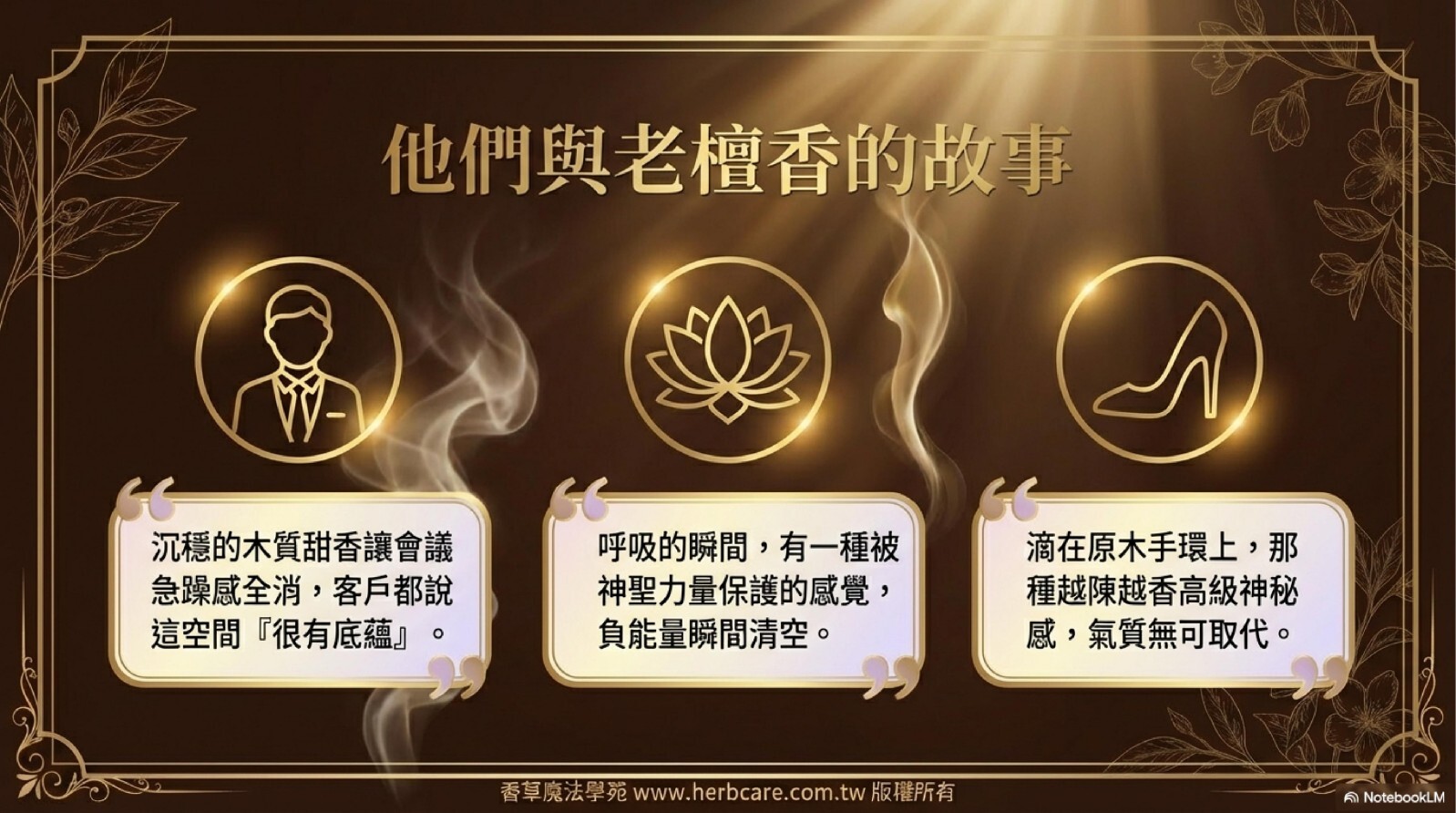 在社交場合使用檀香,則是另一種高明的配方,無疑向全場暗示你的出眾氣質,鎮壓全場同性,收服全場異性,男性女性使用皆然。