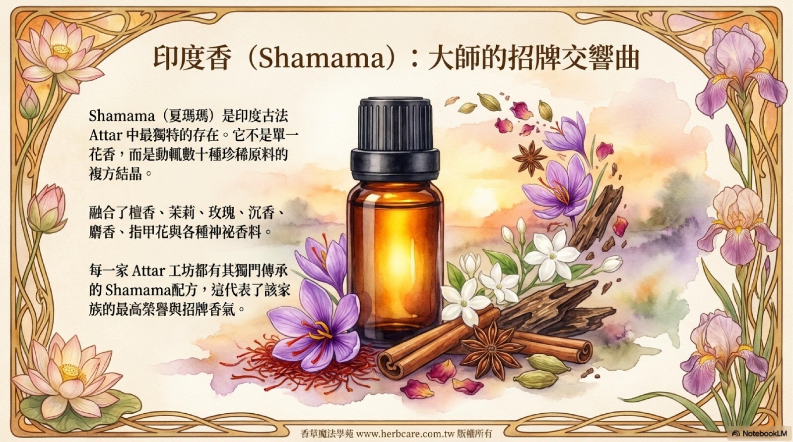 Shamama為印度語,讀音為『夏瑪瑪』,是印度古法Attar緩慢蒸餾提煉的一種傳統的印度精油。它是由多種天然香料和草藥混合而成,通常具有複雜而深刻的香氣,被用作香水、蠟燭、護膚品、香膏和其他香氛產品的基礎。 Shamama非常複雜,動輒幾十種的成分,通常例如檀香、茉莉花、玫瑰花、沉香、龍涎香、瓜那香、麝香、指甲花....等都有可能,每家attar提煉廠都有自己的傳承配方,也都不一樣,這些成分經過精心的混合和蒸餾,製成一種獨特的香氛油。