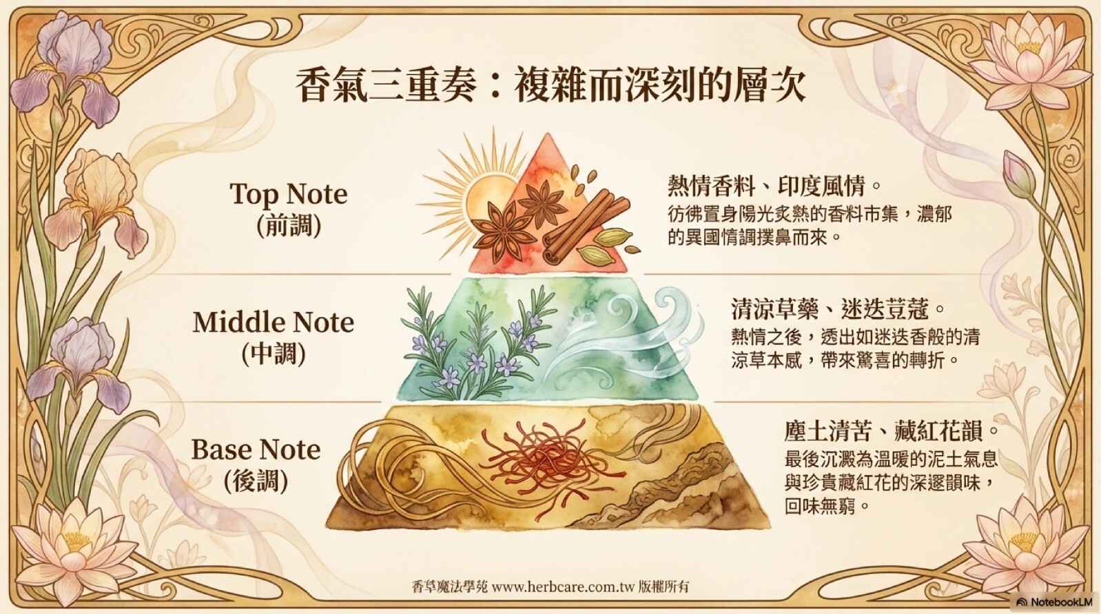 遵循印度千年Attar古法工藝,精選數十種天然香料與草藥,以複雜複方調配藝術呈現正統印度香氛。獨創「香料三重奏」從熱情香料漸變至清涼草藥,終曲沉澱為塵土清苦的深邃餘韻。特別推薦給追求異域風情與深度靈性體驗的香氛探險家。