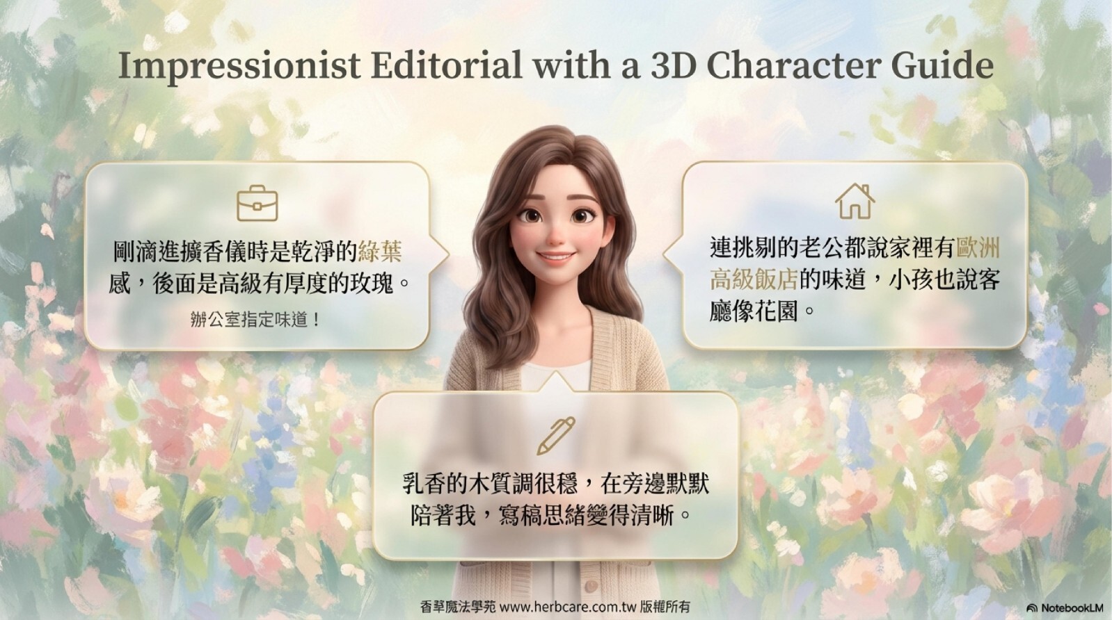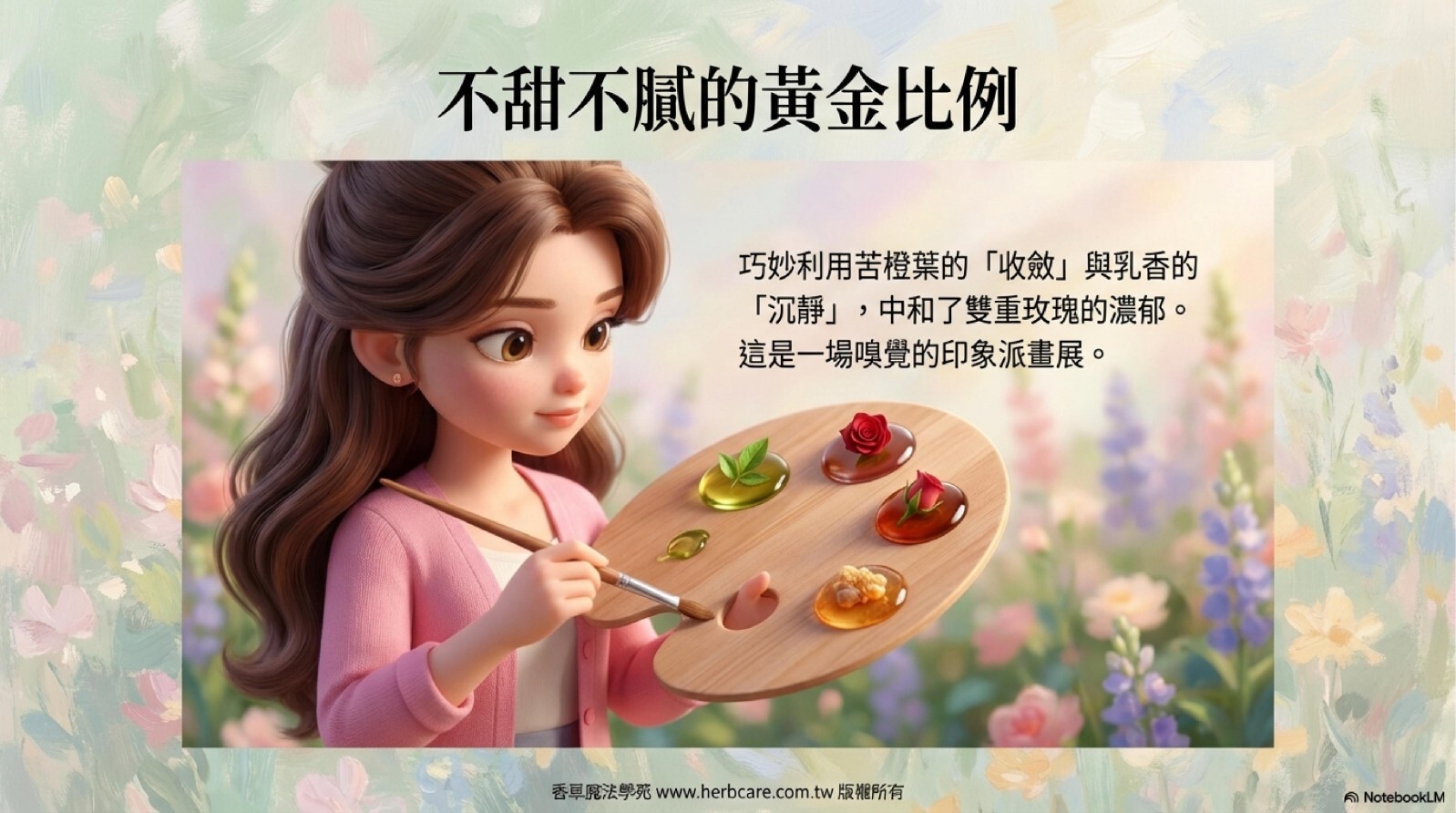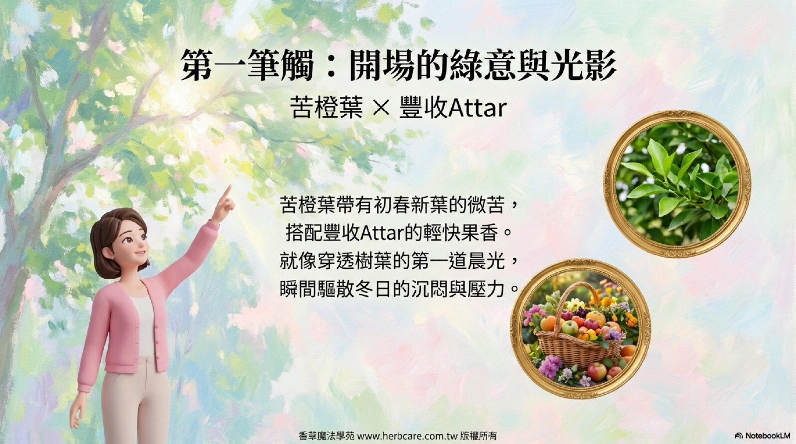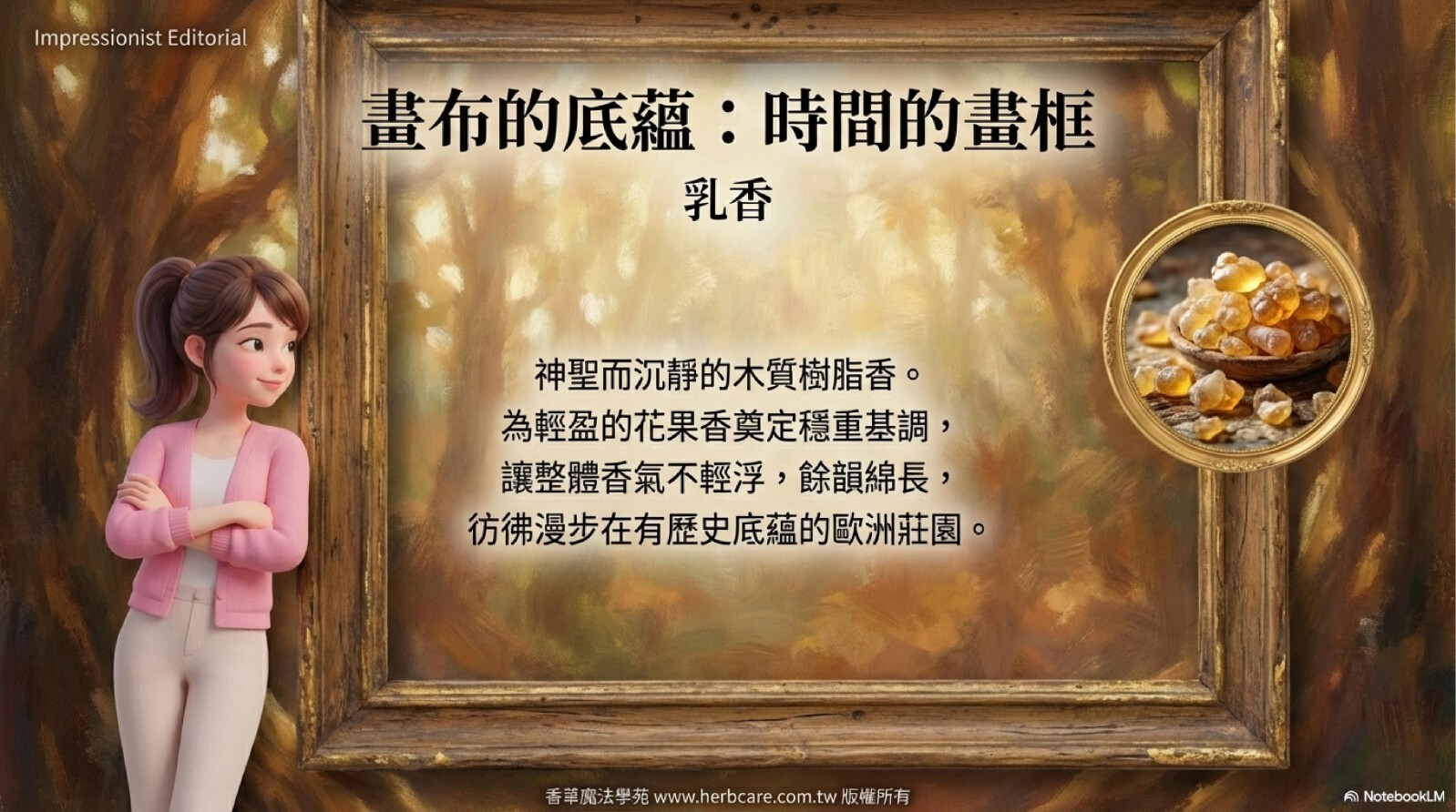 乳香的沉靜木質調緩緩浮現,為整體香氣帶來穩定感與深度,餘韻綿長,如同有底蘊的春日午後。