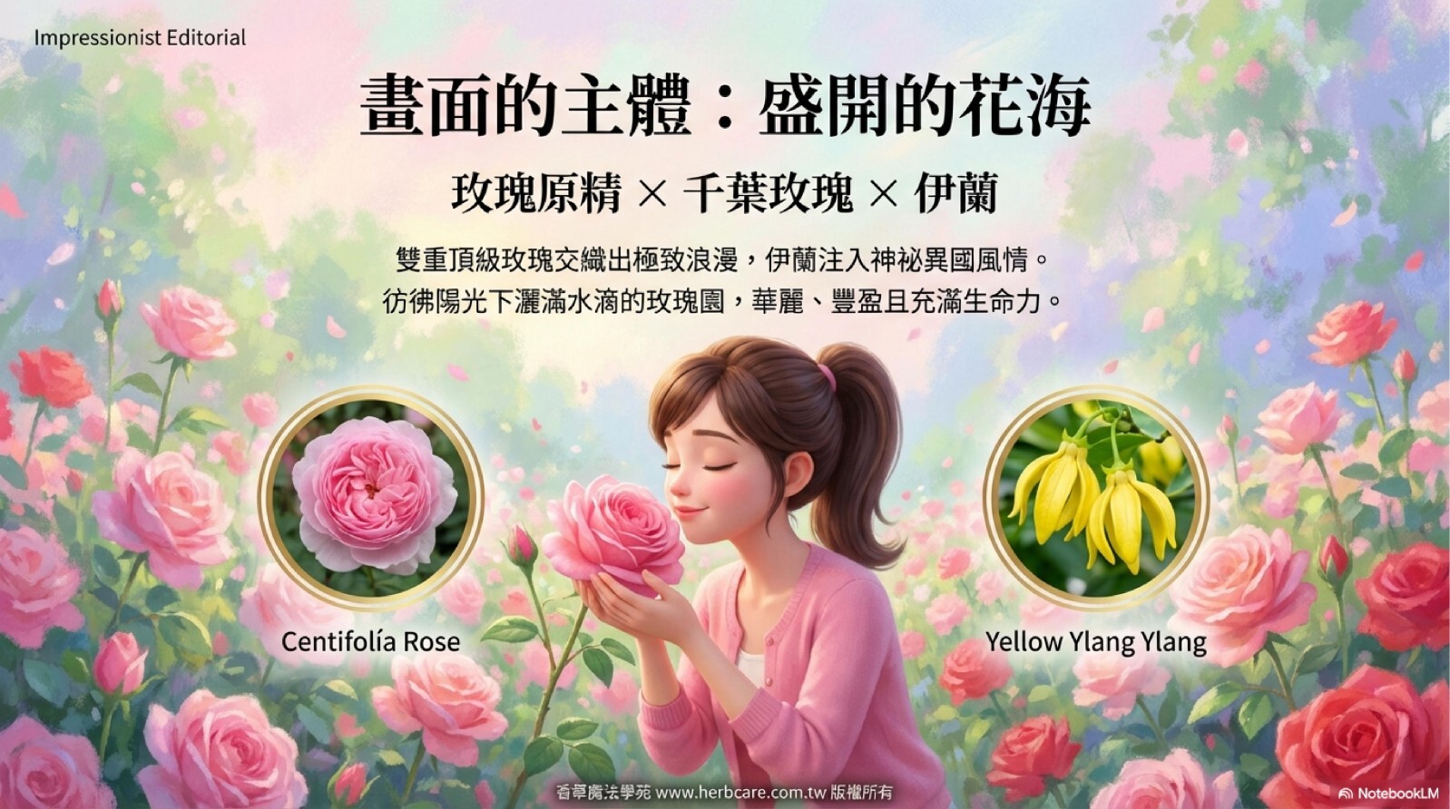 雙重玫瑰的浪漫花香與伊蘭的異國風情交織,千葉玫瑰的細膩與玫瑰原精的濃郁層層展開,如同漫步莫內花園。