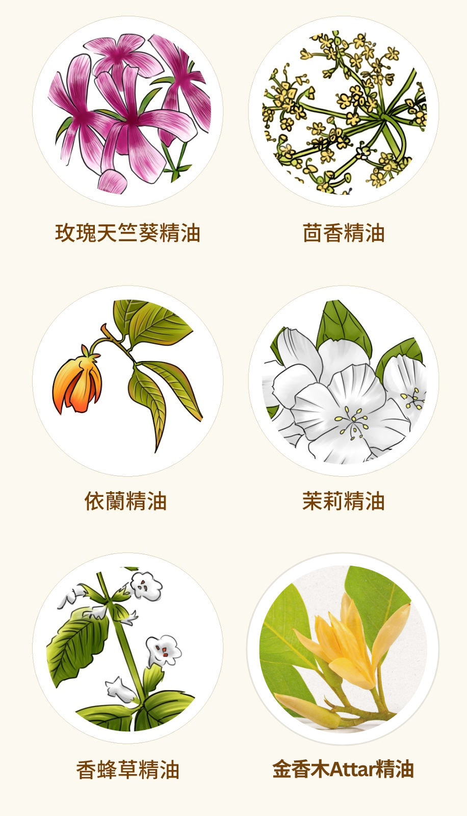 金香木attar精油、玫瑰天竺葵、茴香、依蘭、茉莉、香蜂草精油、葡萄籽油、甜杏仁油、月見草油