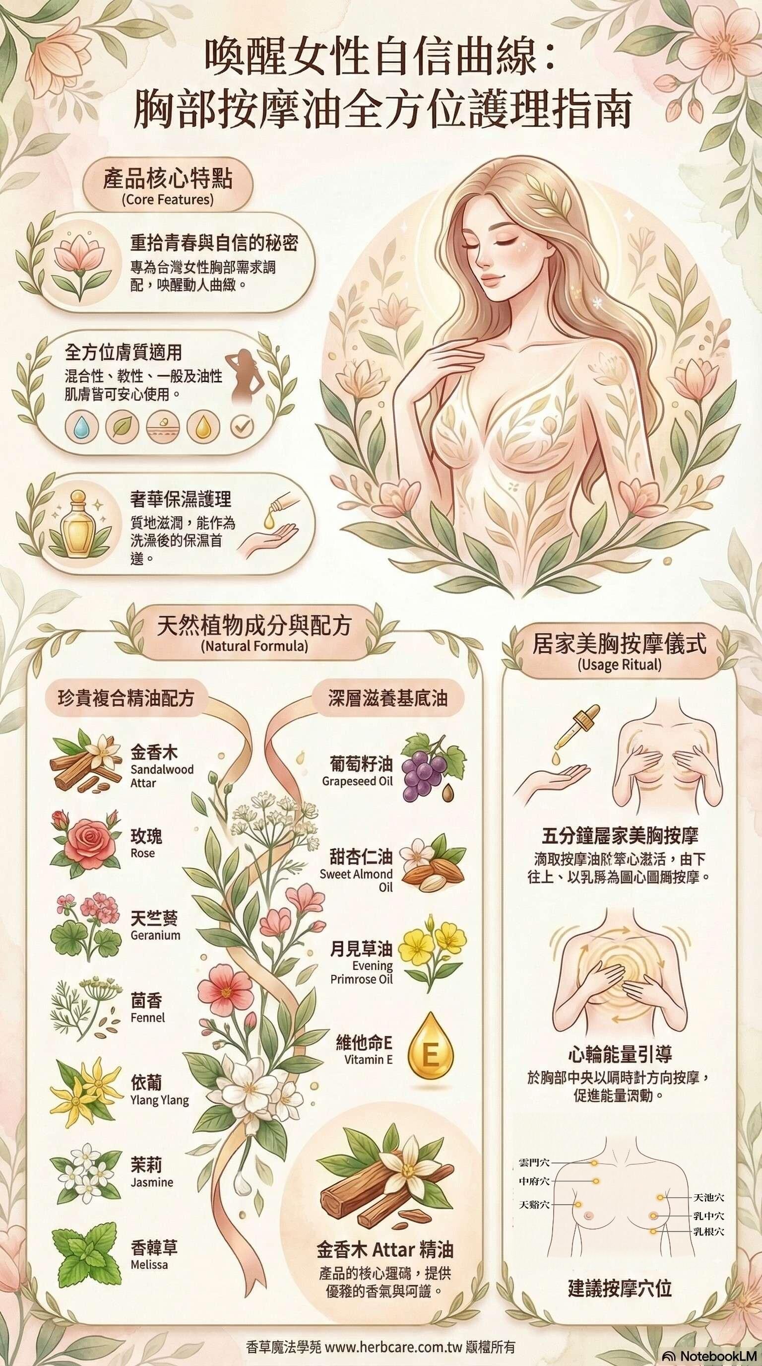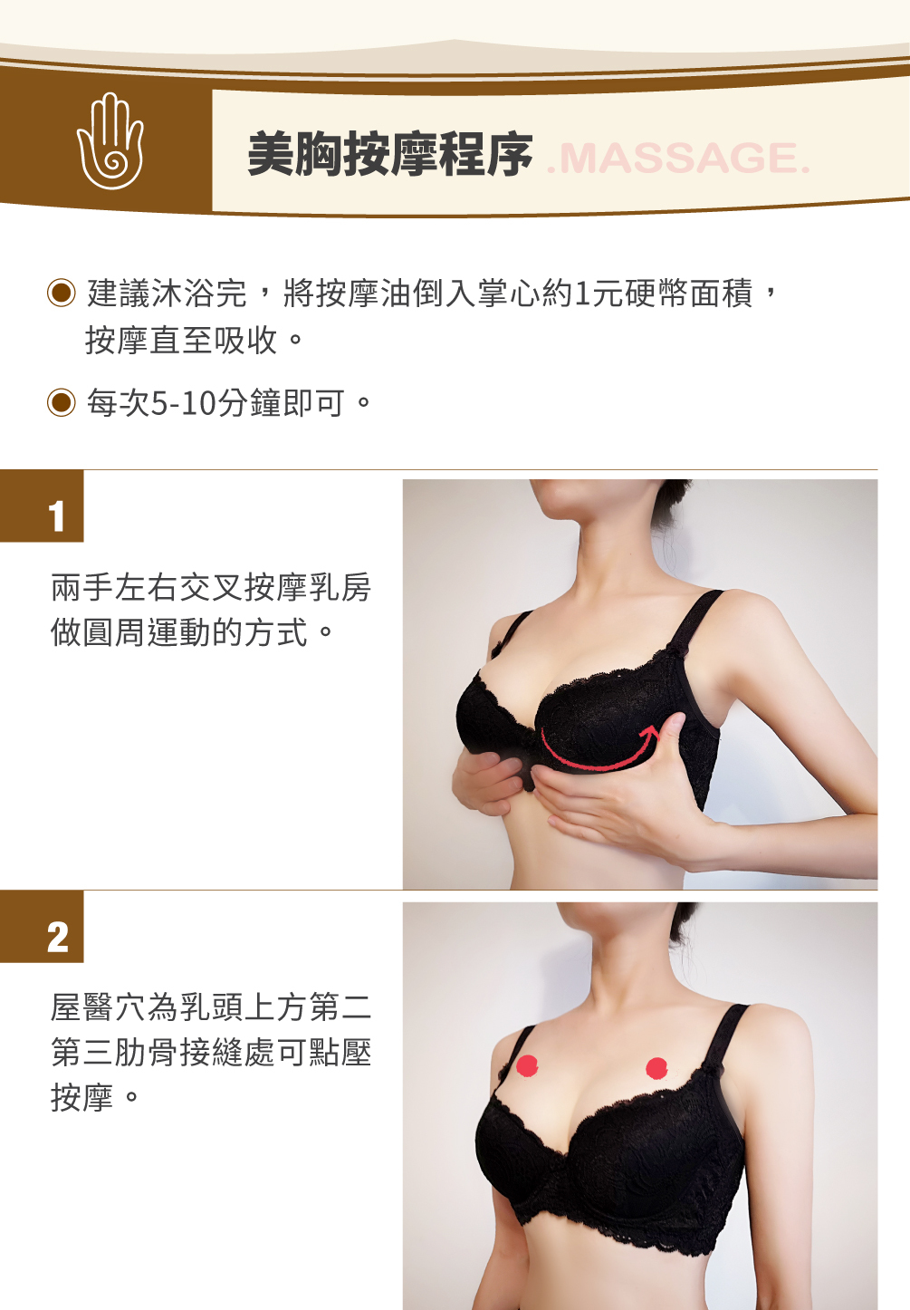 不只是保養護理,更是重拾青春與自信的秘密武器!以金香木attar精油、玫瑰、天竺葵、茴香、依蘭、茉莉、香蜂草等精油,搭配葡萄籽油、甜杏仁油、月見草油、維他命E,專為台灣女性胸部設計,以胸部重視的各種需求做調配,每一滴都讓妳喚醒胸部曲線,從少女到熟女都值得擁有的專屬美胸奢華,搭配合適按摩手法,擁抱最美的自己。