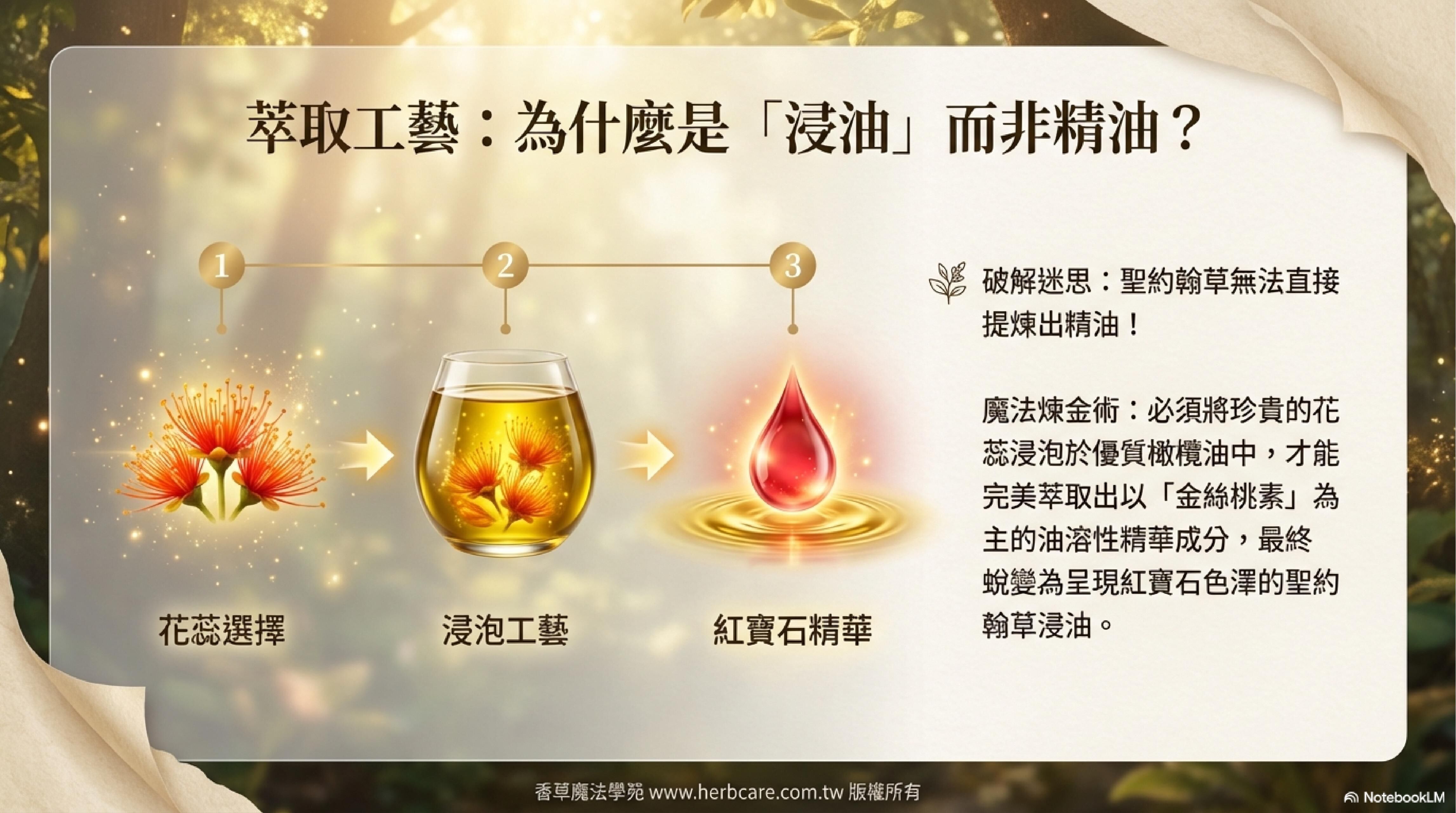 聖約翰草無法提煉精油,所以會將其花蕊用橄欖油浸泡,萃取出以金絲桃素為主及其他油溶性成分,成為聖約翰草浸油。
