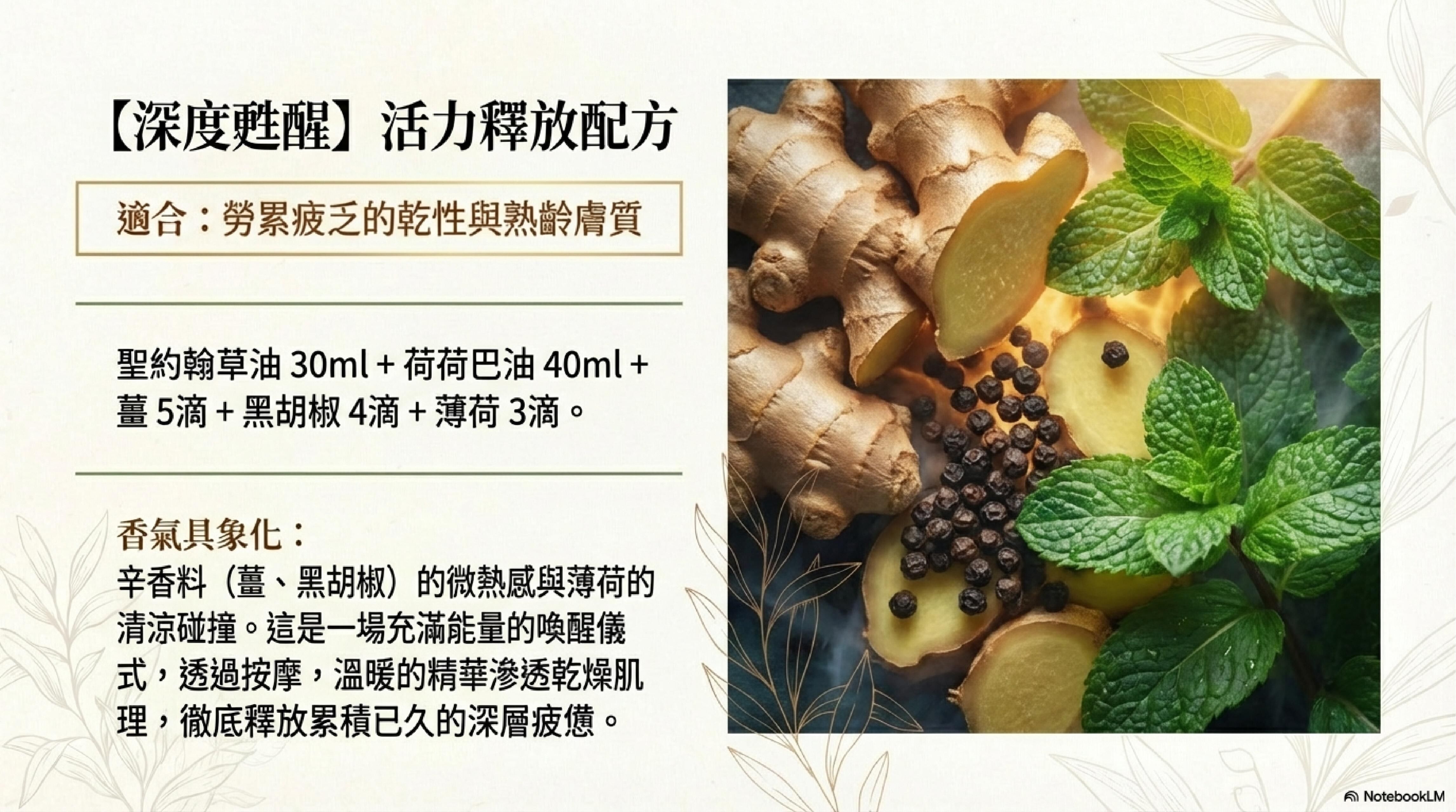 精油:姜油 5滴、黑胡椒油 4滴、薄荷油 3滴