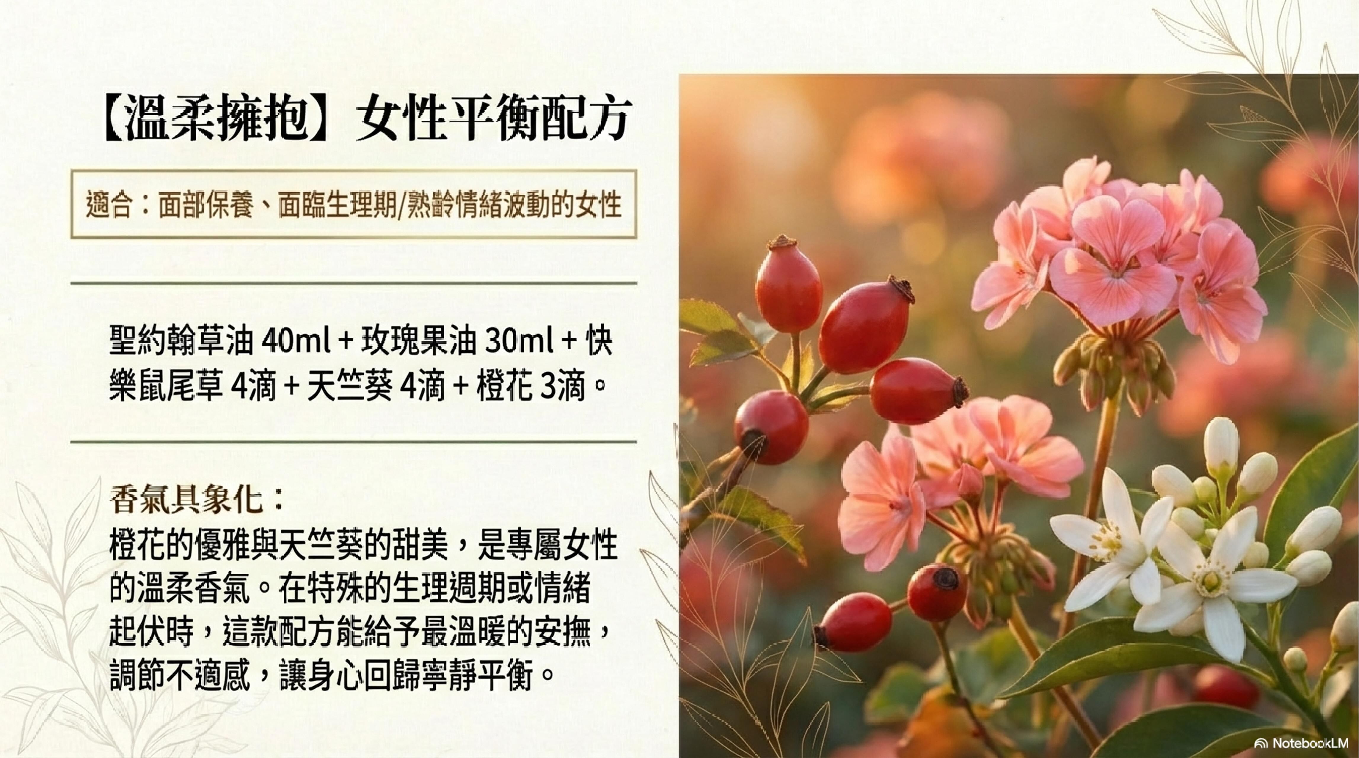 基底油:聖約翰草油 40ml、玫瑰果油 30ml