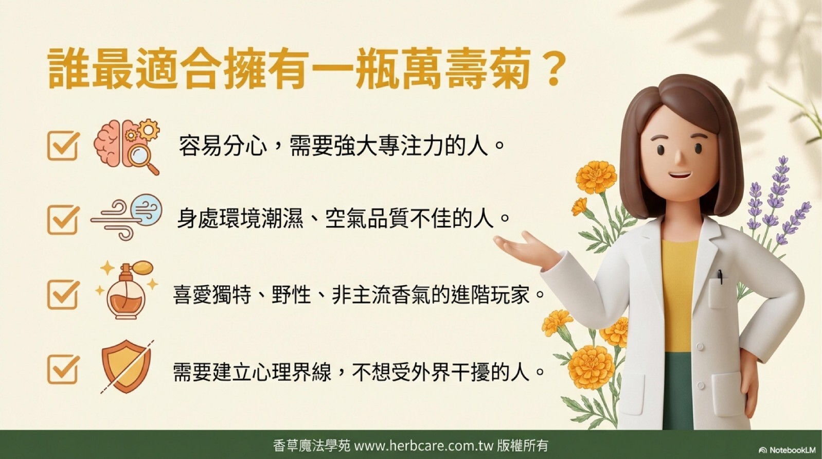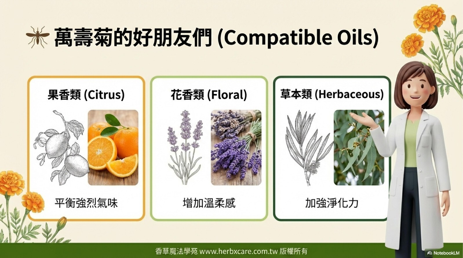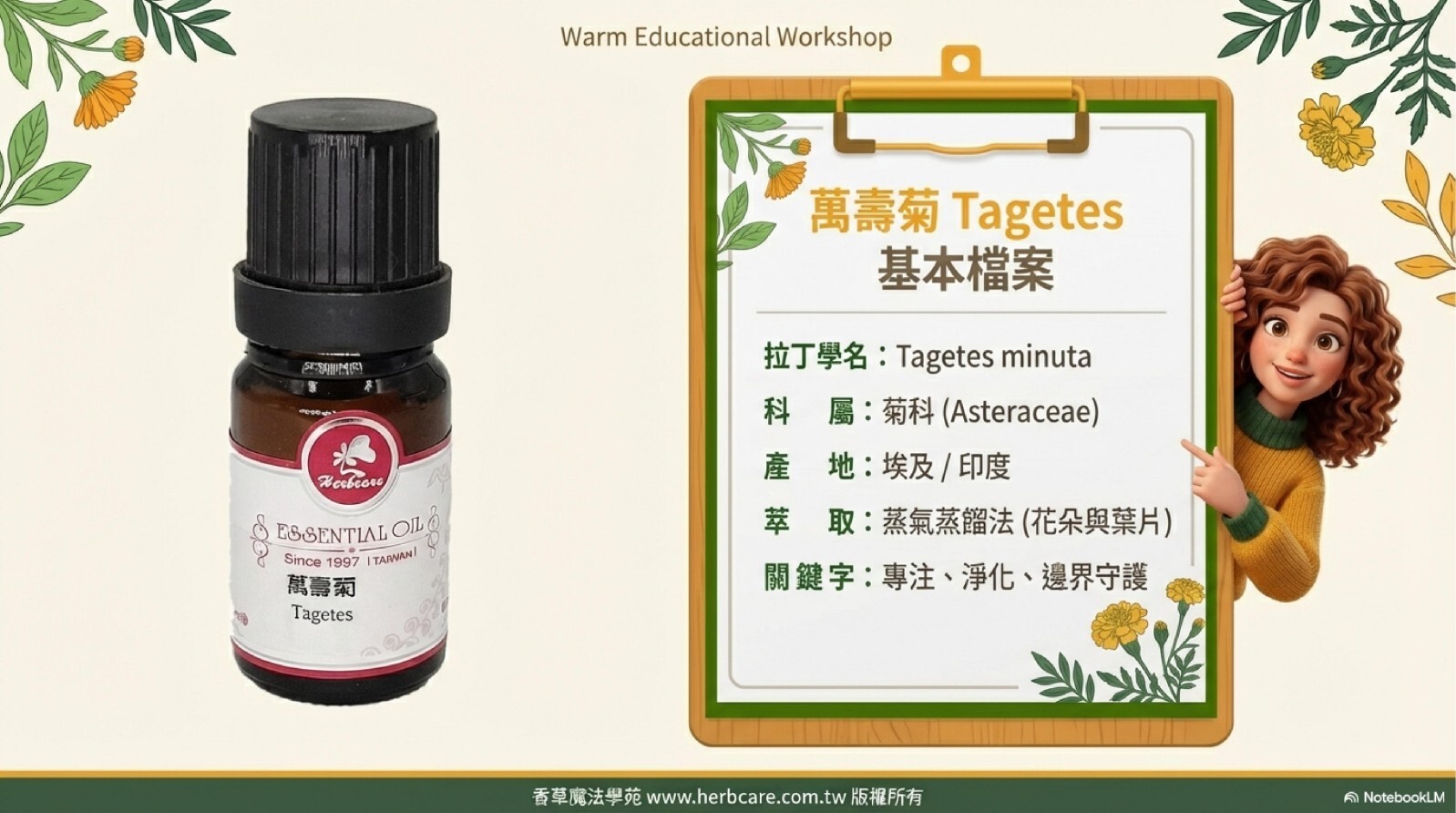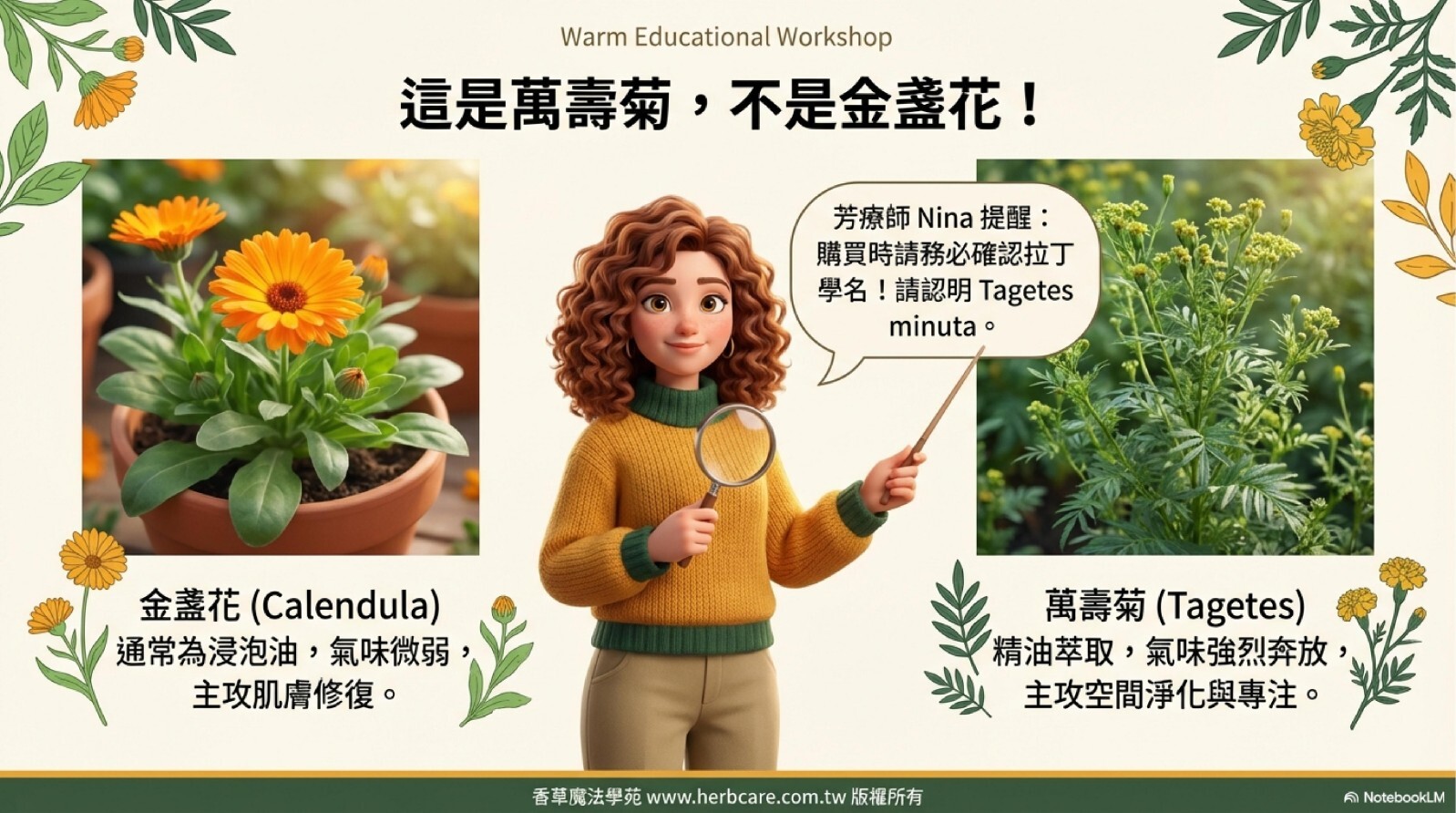 「挑選精油時,拉丁學名是唯一的真理!萬壽菊與金盞花功能天差地遠,購買前記得看清楚瓶身標示,才不會辜負了植物的一片心意喔!」