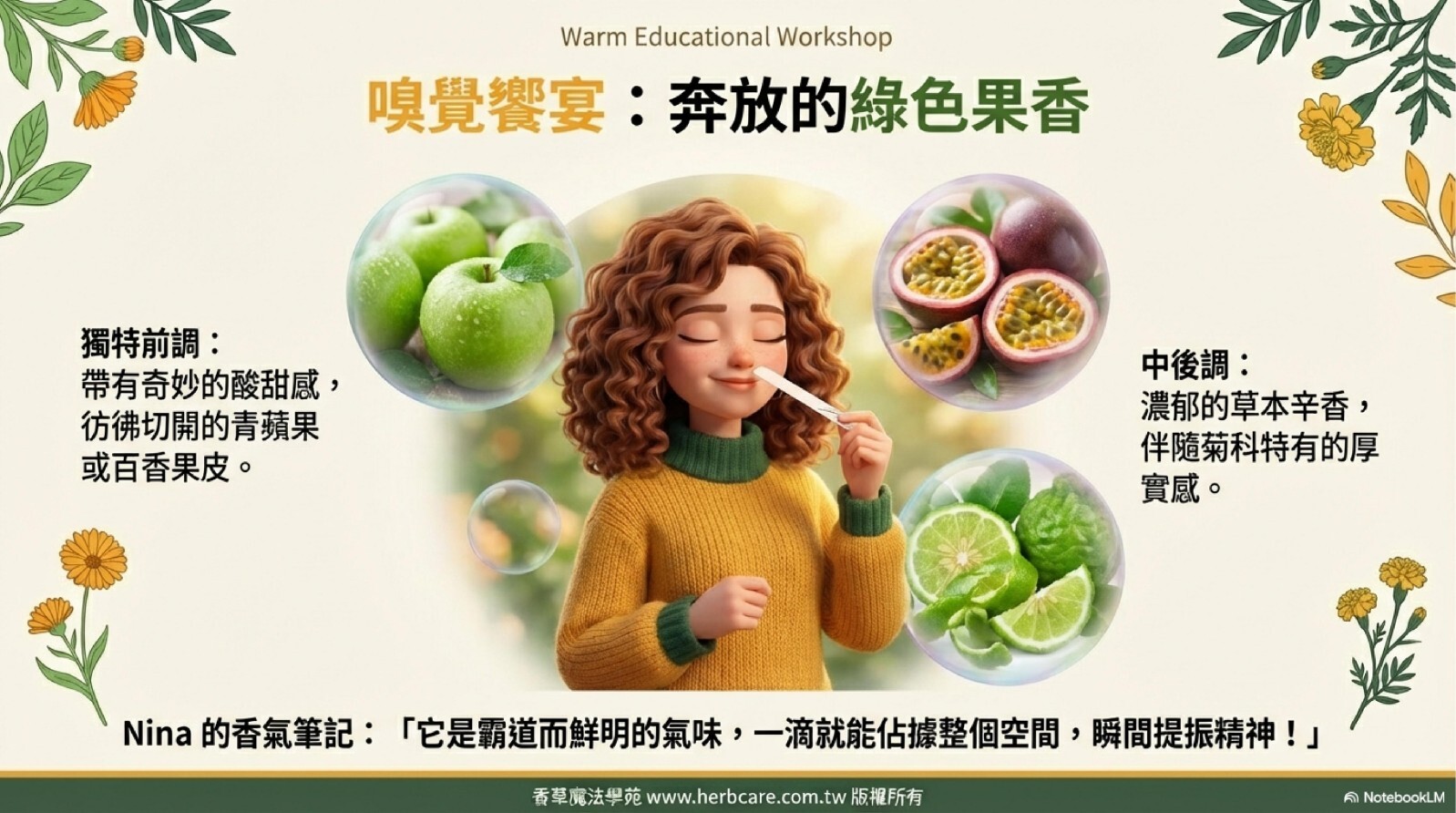 萬壽菊(Tagetes)有著鮮豔奪目的橘黃色花朵,它的氣味極具穿透力——強烈、奔放,帶有一股獨特的「綠蘋果皮」般的果香與濃郁草本味。
