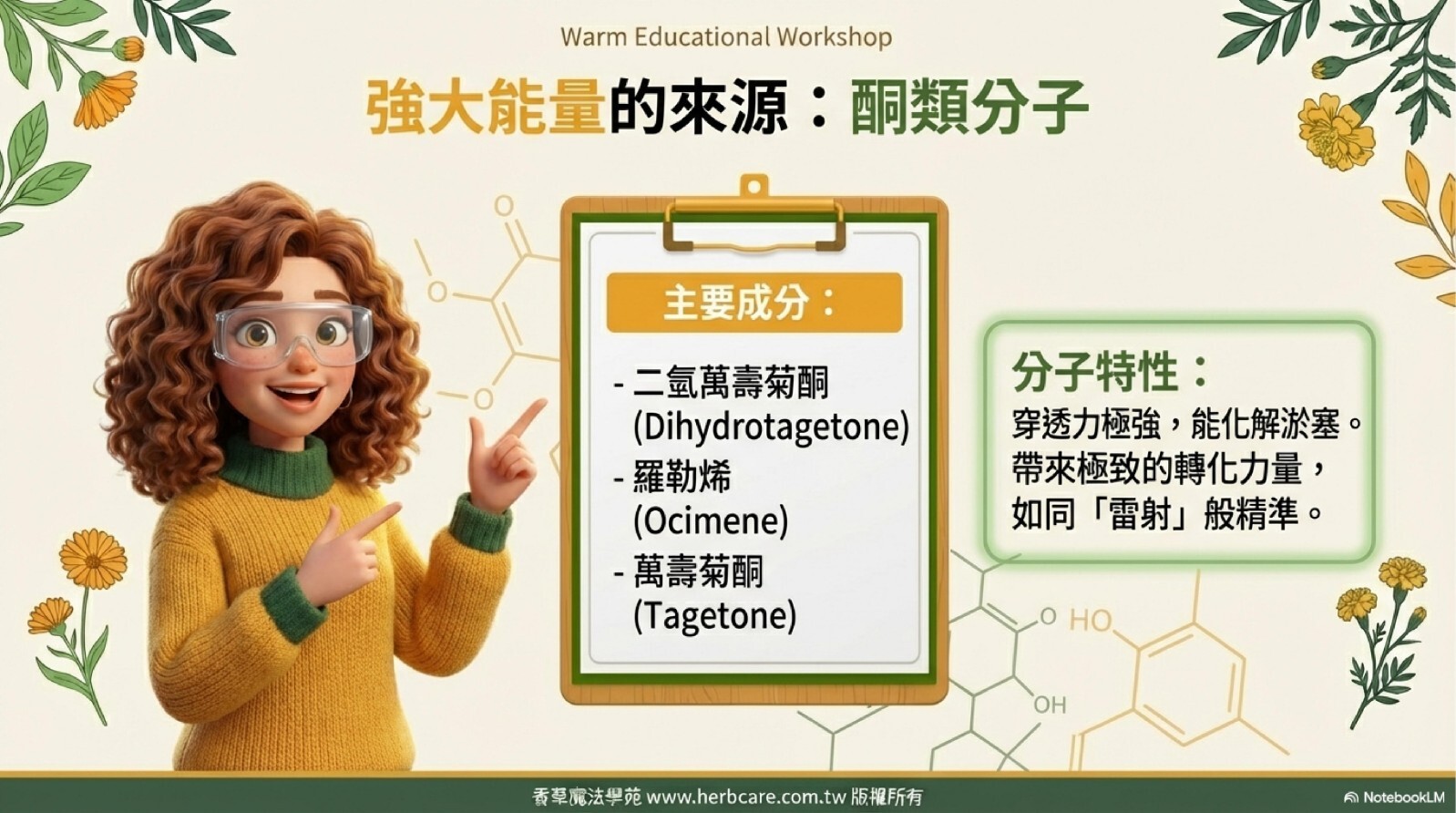 萬壽菊精油含有獨特的「酮類」分子(萬壽菊酮),這是它強大功效的來源,也是需要謹慎使用的原因。