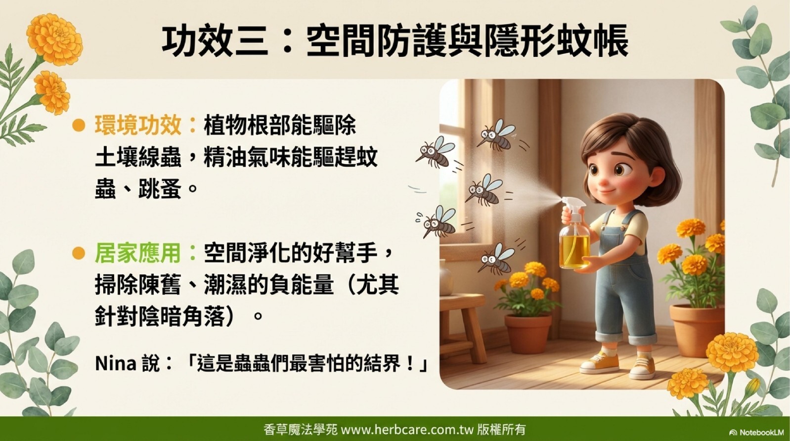 有經驗的園丁會在菜園四周種滿萬壽菊。為什麼?因為萬壽菊根部分泌的物質能驅除土壤中的線蟲,葉片的氣味能趕走害蟲。這種「天生防禦力」也被完整保留在精油中,使其成為極佳的天然驅蟲劑與環境淨化油。