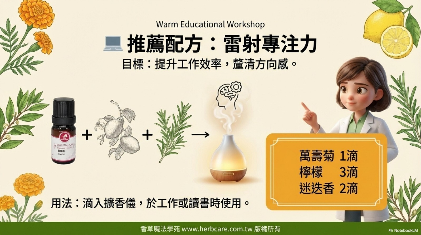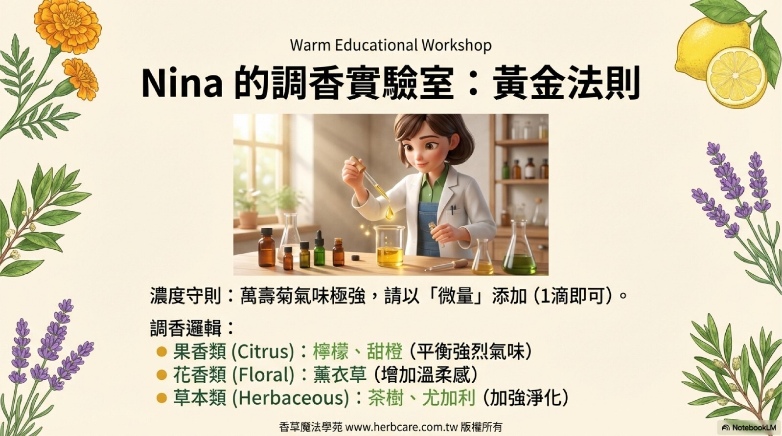 | Dihydrotagetone (二氫萬壽菊酮) | 10-25% | 關鍵成分! 提供獨特的果香與極強的防護能力。但也因此具有光敏性與潛在的神經毒性(需低劑量)。 |