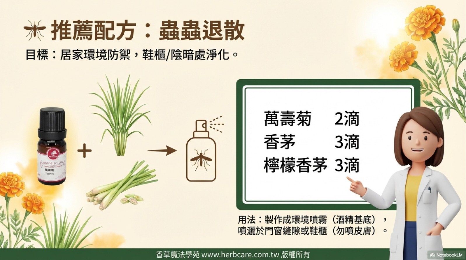 👉 用法: 搖勻後噴灑於衣物袖口、褲腳或鞋子上(避免直接噴灑皮膚,因具光敏性)。那股強烈的草本香氣是蟲蟲們最害怕的結界。