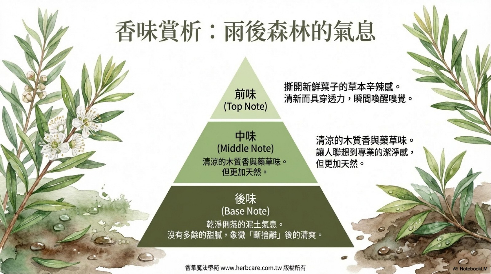 茶樹的香氣如同它的效用一樣,直接而純粹,充滿了乾淨的草本氣息。