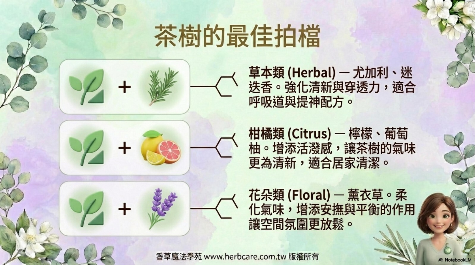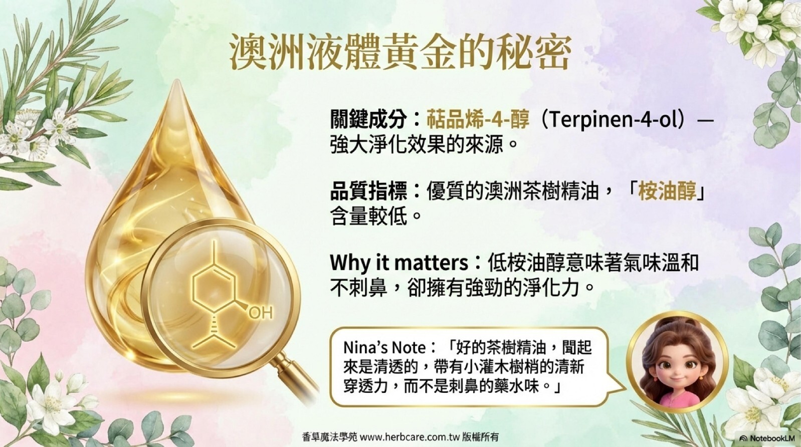 | 種類/品種差異 | 茶樹精油有多個品種,但最廣泛用於芳療的是澳洲茶樹 (Melaleuca alternifolia)。其成分中萜品烯-4-醇含量高,這是其淨化效果的主要來源,而桉油醇含量則較低,因此氣味溫和,刺激性也較小。 |