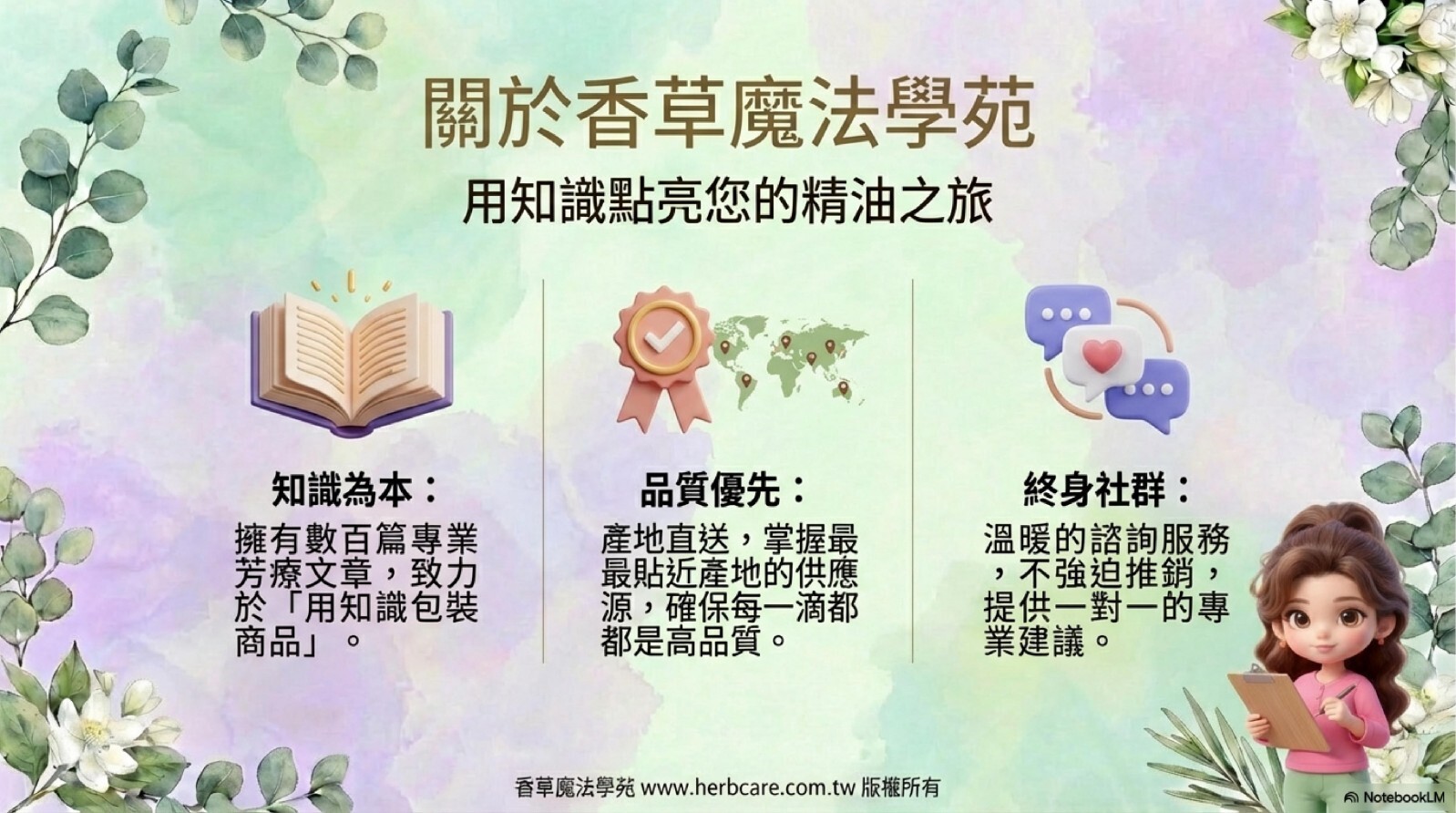創立於20多年前,香草魔法學苑不只是個精油網站,更是由一群熱愛精油的同好共同打造的學習社群。我們相信,精油不只是商品,而是能優化身心靈的美好工具。因此,我們致力於「用知識包裝商品」,讓你先了解精油,再找到最適合你的選擇。