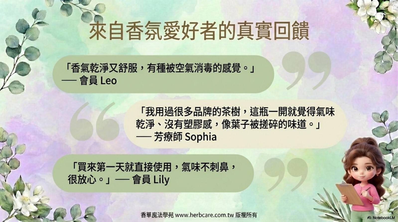 | A4: 孕婦使用任何精油前都應諮詢專業芳療師或醫師。茶樹精油相對溫和,但在孕期應特別注意使用濃度與劑量。 |