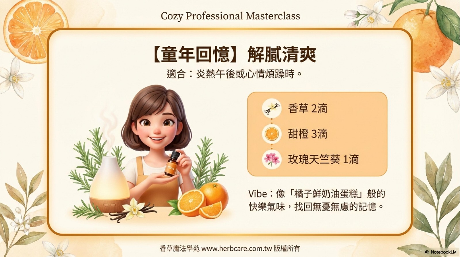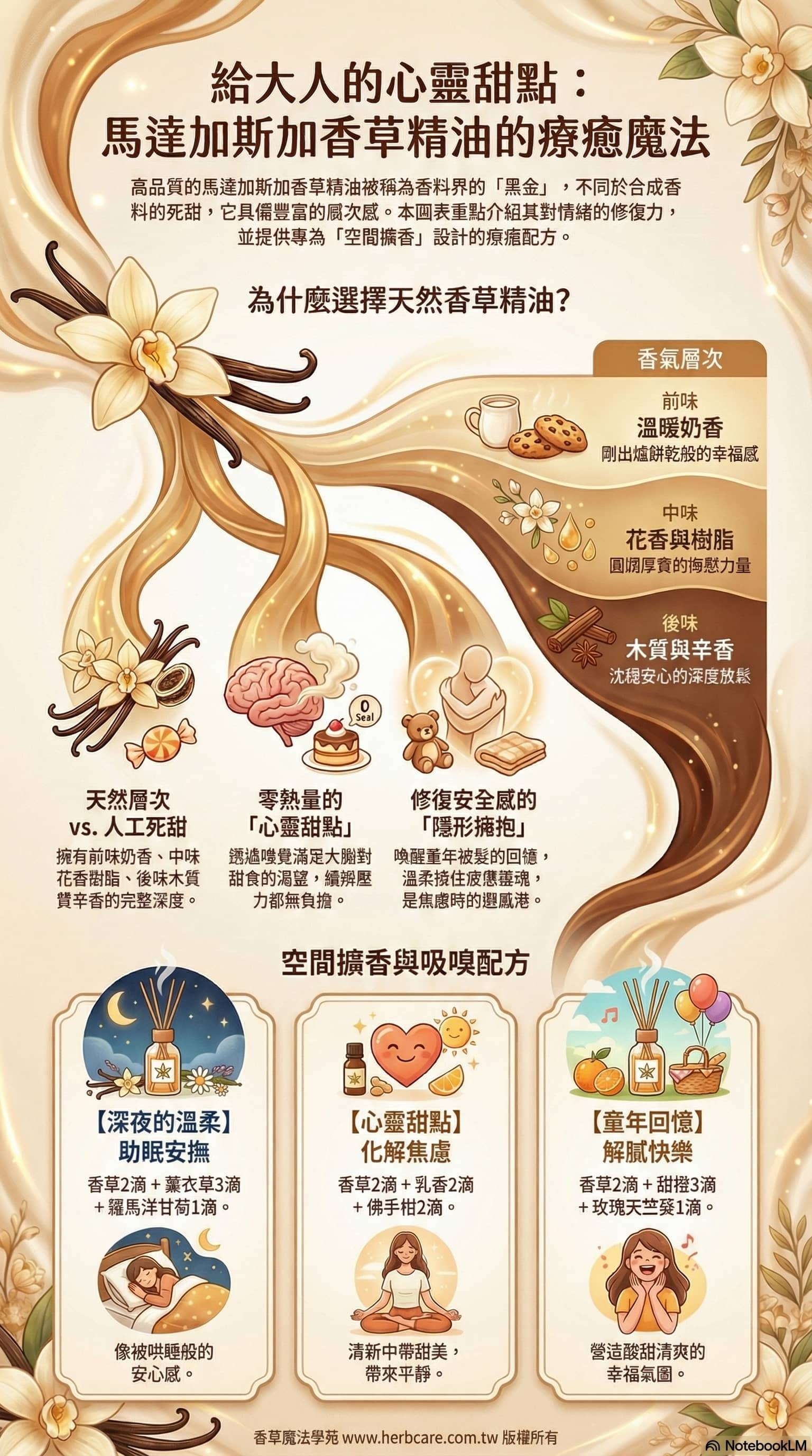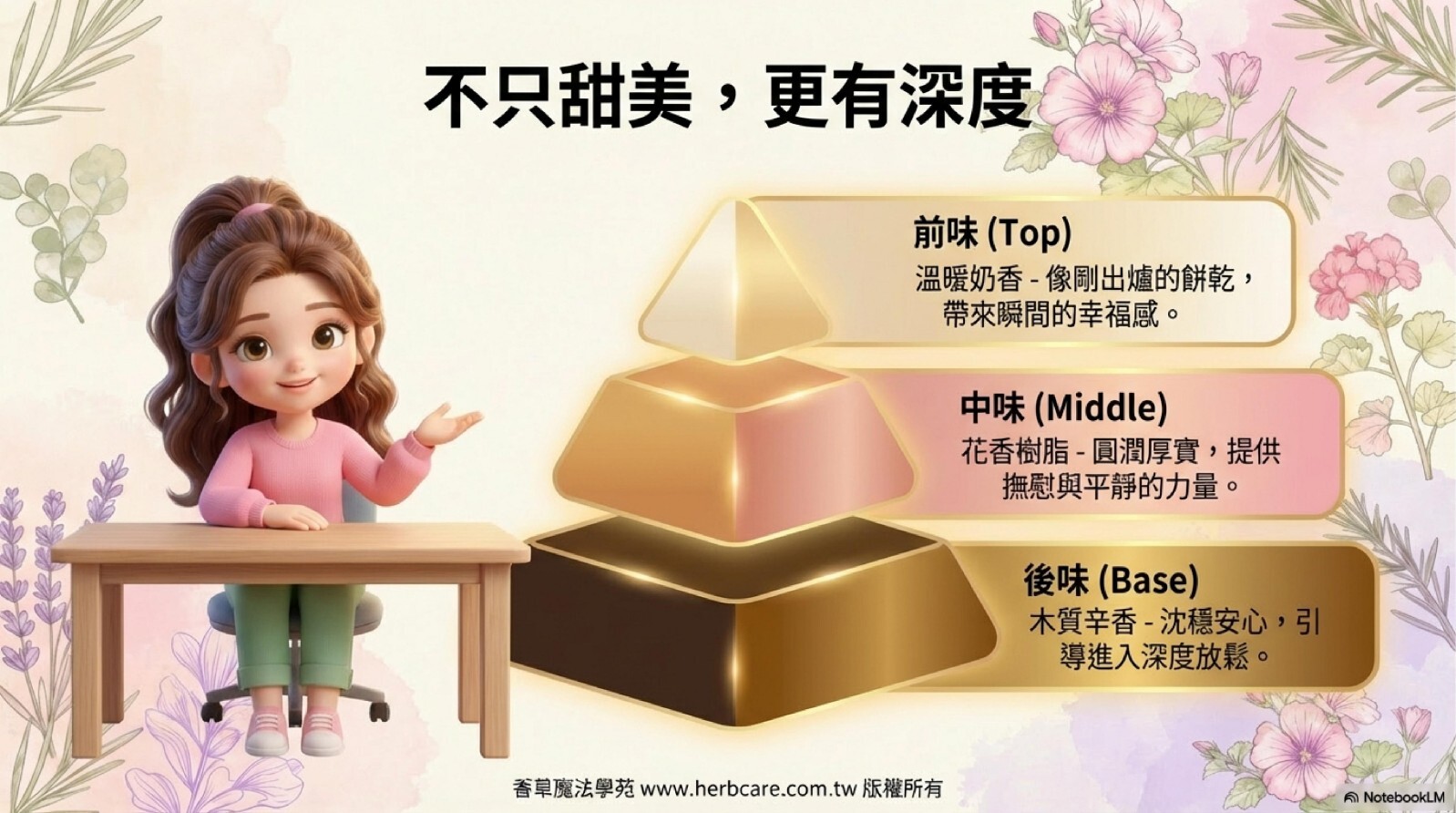 | A1: 香草精油的主要成分是香草醛,這是一種帶有濃郁奶香與甜味的分子,同時也是香草莢中獨特的香氣來源。聞到它,就像是品嚐了一份溫暖的甜點,自然而然就感到心情愉悅。 |
