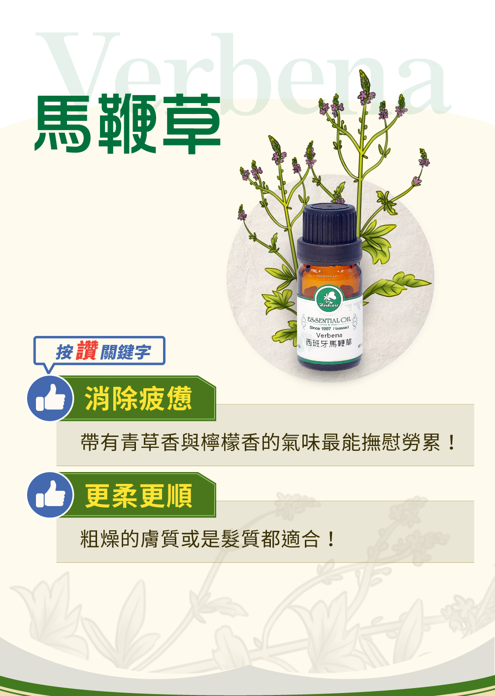 馬鞭草精油,清新的草香中,帶有檸檬般甜美氣息,常用於居家擴香,消除疲憊,使人情緒放鬆,心境開朗舒暢,還能讓室內彷彿地中海岸的春日時光。馬鞭草精油是芳療師公認的「柔順高手」,氣味芳香並有多元保養成分,是許多香水和洗護產品常用的原料,毛躁髮質與粗糙膚質配方必備馬鞭草精油。
