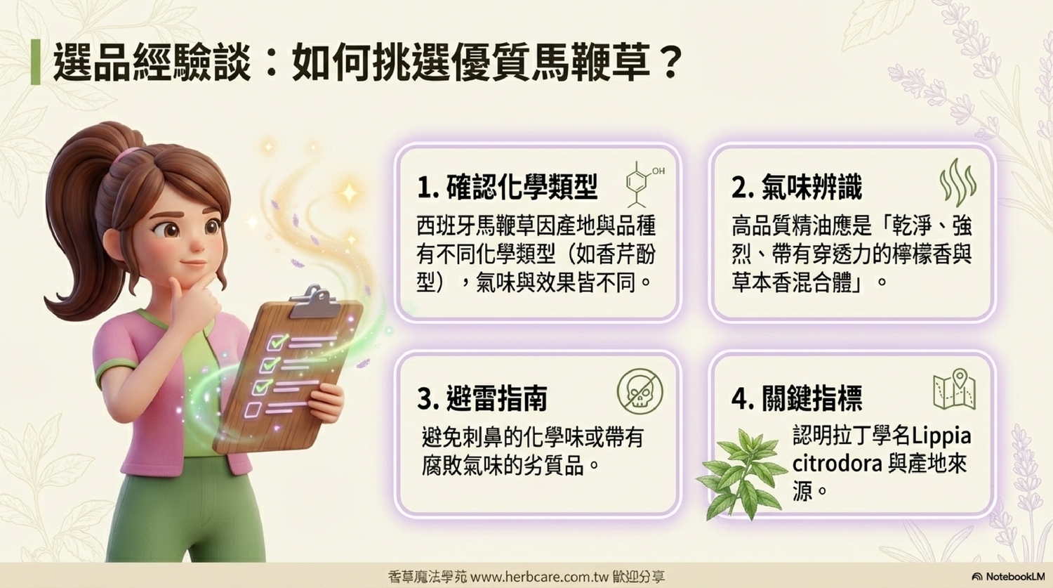 挑選馬鞭草精油時,因為其有不同的品種與產地,所以最關鍵的是確認其化學類型與產地。由於西班牙馬鞭草精油的成分會因品種而異,不同化學類型 (如香芹酚類型) 的氣味與效果也會有所不同。高品質的西班牙馬鞭草精油聞起來應是乾淨、強烈、帶有穿透力的檸檬香與草本香的混和體,而不是有刺鼻的化學味或腐敗的氣味。