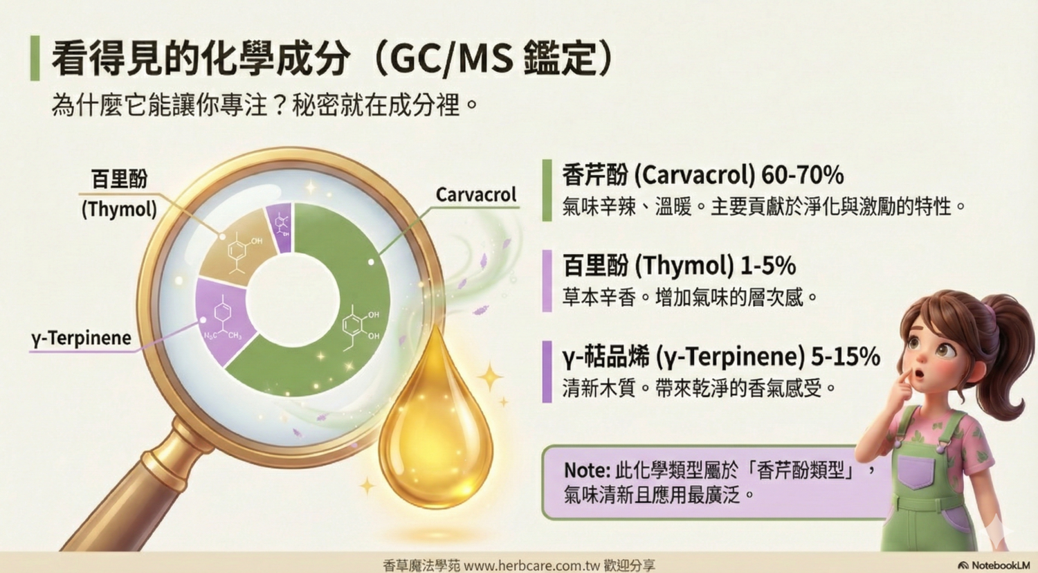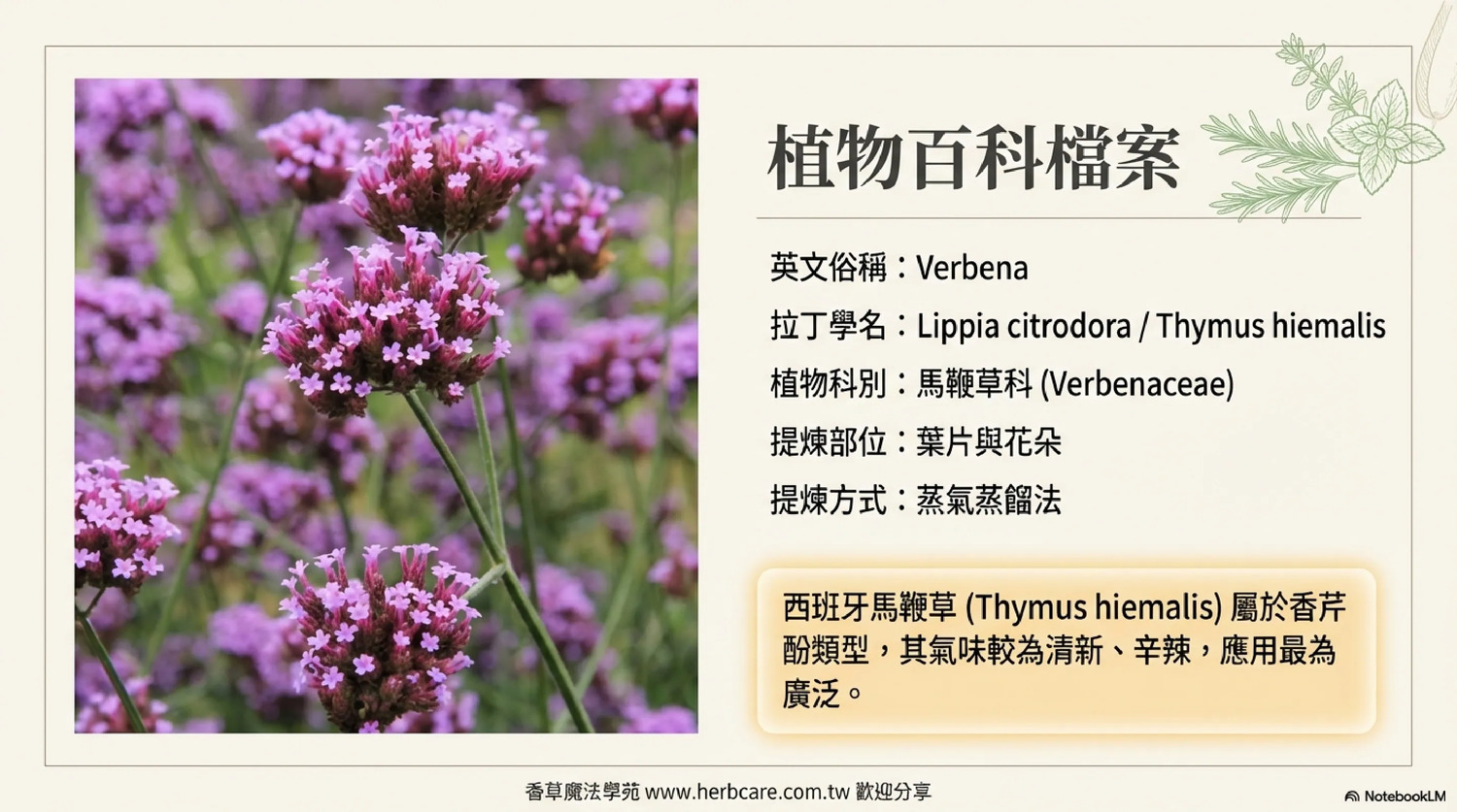 | 種類/品種差異 | 西班牙馬鞭草精油因其化學結構不同,主要可分為數種化學類型。此處介紹的西班牙馬鞭草 (Thymus hiemalis) 屬於香芹酚類型,其氣味較為清新、辛辣,應用最為廣泛。 |