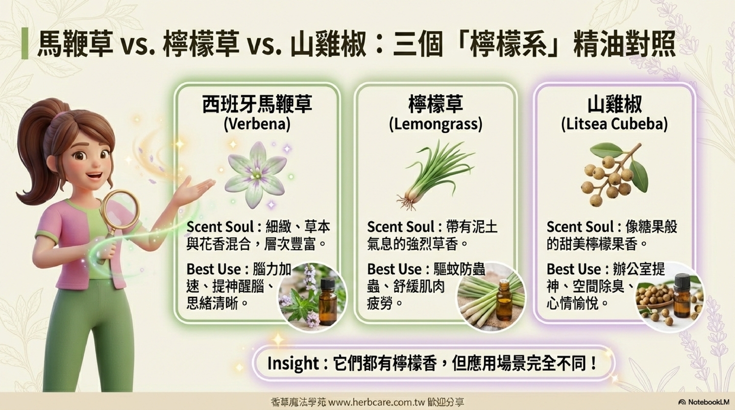 「馬鞭草 vs 檸檬草 vs 山雞椒」精油對照表,方便你快速比較: |