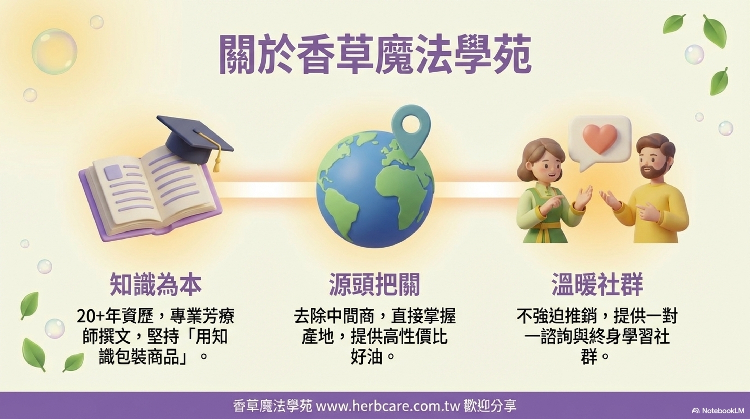 創立於20多年前,香草魔法學苑不只是個精油網站,更是由一群熱愛精油的同好共同打造的學習社群。我們相信,精油不只是商品,而是能優化身心靈的美好工具。因此,我們致力於「用知識包裝商品」,讓你先了解精油,再找到最適合你的選擇。