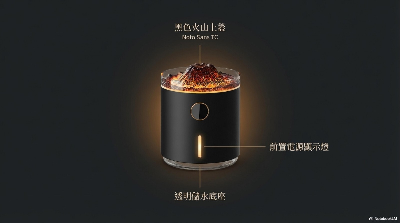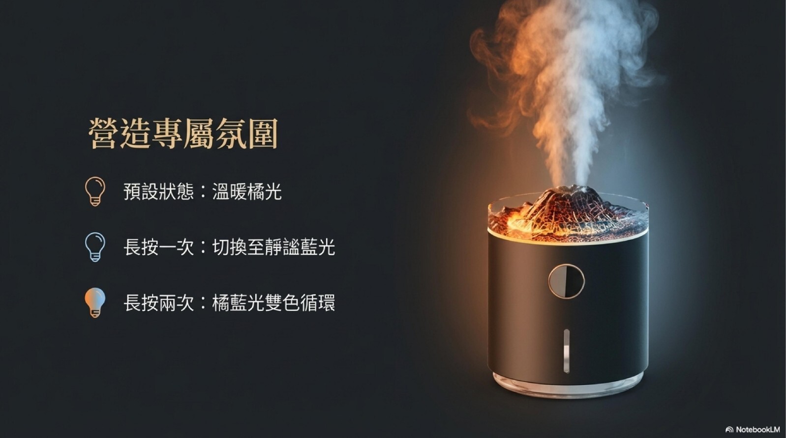 獨特的火山造型設計,搭配擬真火焰燈光與煙圈噴發效果,這款火山香氛水氧機不僅能為您的居家空間帶來迷人香氣,更是一場視覺享受。機身採高質感黑色霧面設計,正面配有電源顯示點,背面則設有簡潔的 USB 電源孔與操作按鍵。