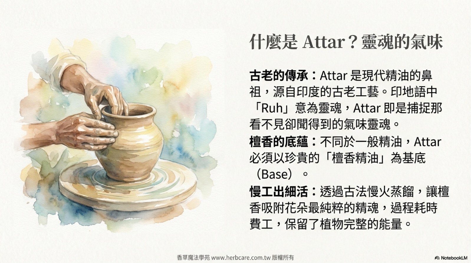 對原產地印度及主要使用市場伊斯蘭國家來說,香水也是一種藥,是針對身心靈各方面都有作用的,所以一開始我們就把香水與靈藥當作阿塔的定義。