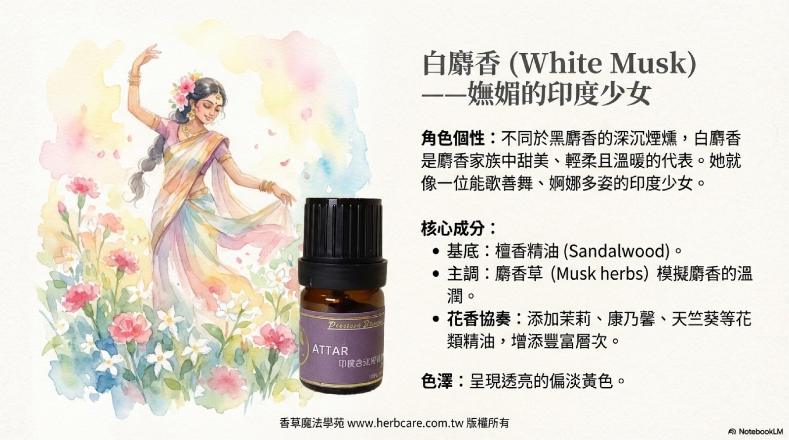 把麝香配方中屬於甜美感、輕柔感、溫暖感部分強化,在多加些花類材料,就是白麝香,像是印度女性那種嫵媚性感、能歌善舞、婀娜多姿的誘人。
