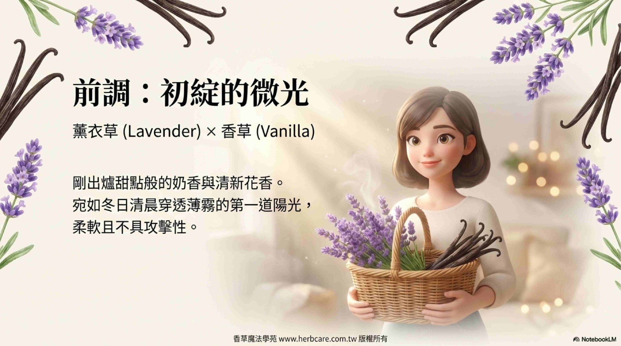 薰衣草的清新花香與香草的甜美溫暖率先綻放,如同冬日清晨的陽光,帶來清新與溫暖的第一印象。
