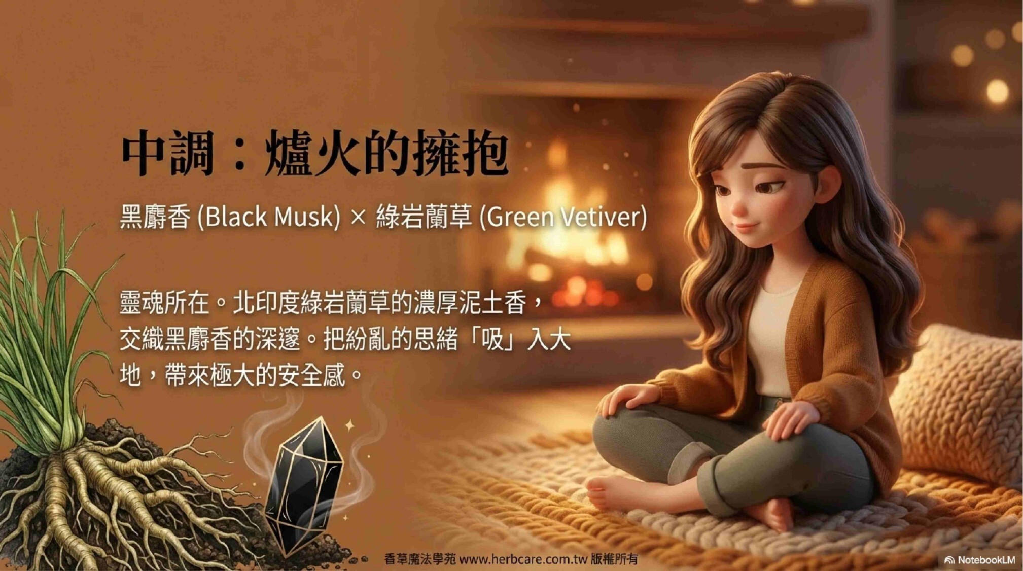 黑麝香的深邃厚實與綠岩蘭草的大地氣息交織,如同圍坐在爐火旁,感受冬日的寧靜。
