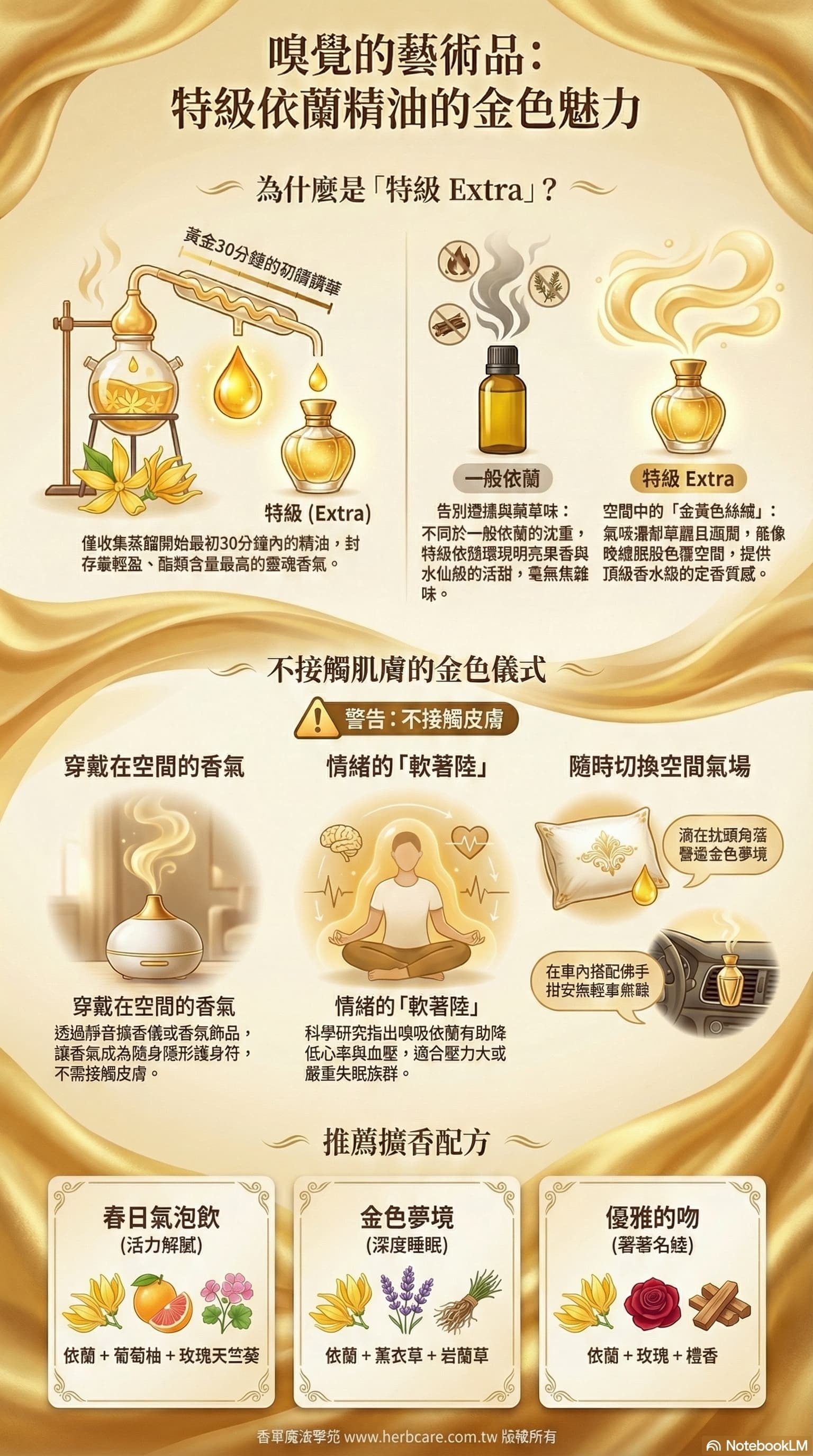 | 特級 (Extra) | 最初 1-2 小時 | 香氣最細緻、高揚:帶有明亮、甜美、花香果香調,是依蘭最具代表性的香氣。 | 乙酸香葉酯、沉香醇氧化物等酯類含量最高,分子最輕。 |