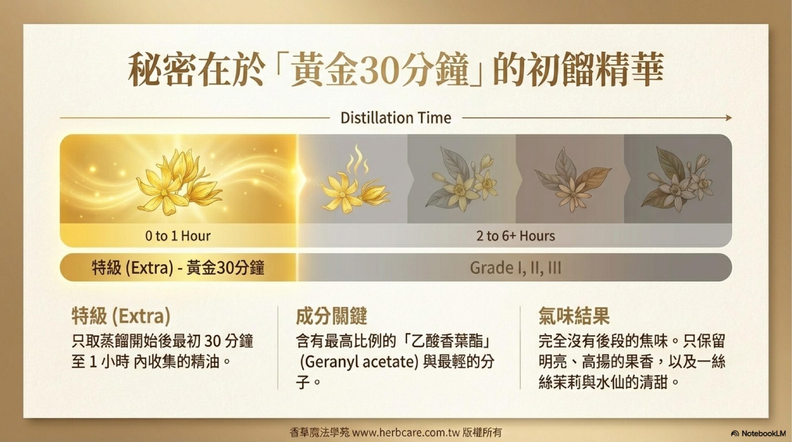 | 等級 | 蒸餾時間 | 香氣特徵 | 化學成分特點 |